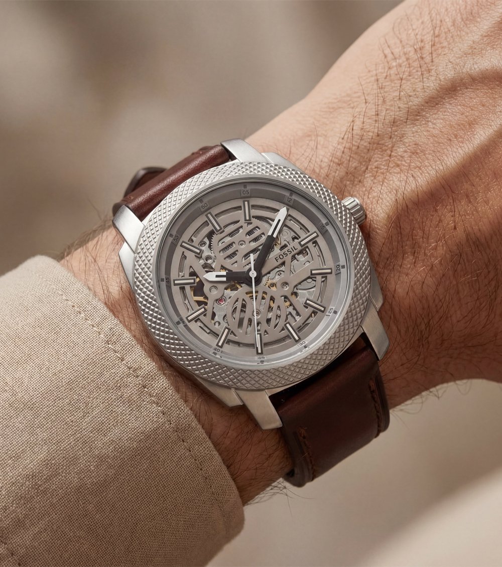 HomeShopWatch MenLuxury Skeleton Dial Automatic Men’s Watch with Textured Steel Case & Brown Leather Strap