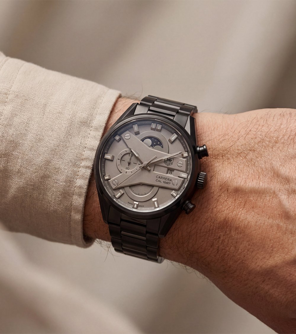 This matte black Men’s chronograph watch delivers a bold industrial aesthetic with precision engineering. The layered grey dial showcases a mechanical-inspired layout with exposed-style bridges, sub-dial detailing, and a moonphase-style window that adds depth and character.