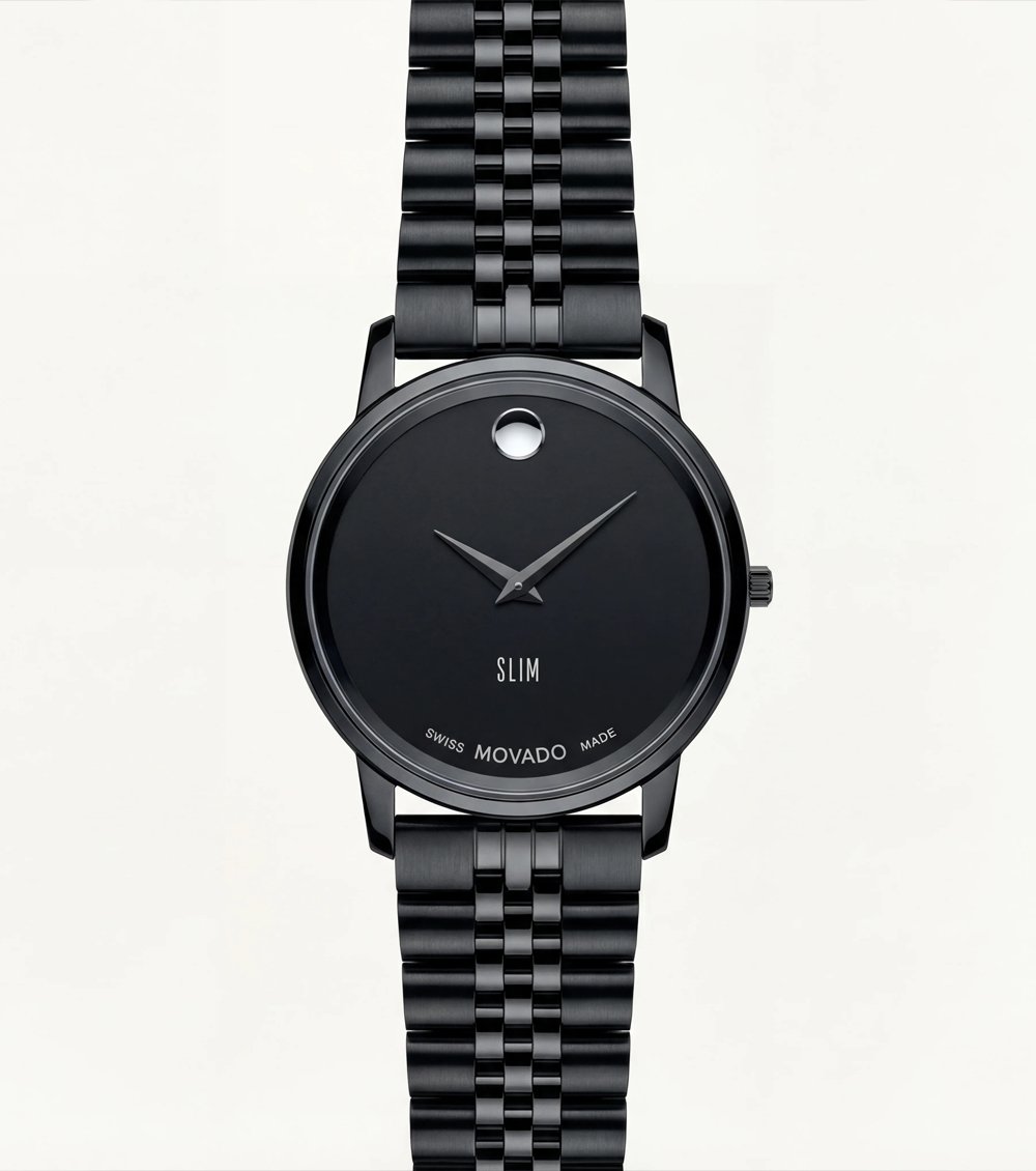This premium men’s watch features a sleek matte black minimalist dial highlighted by a single signature dot hour marker and ultra-slim hands for a clean, modern look. The slim-profile black stainless steel case and matching solid link bracelet create a refined monochrome aesthetic that reflects understated luxury.