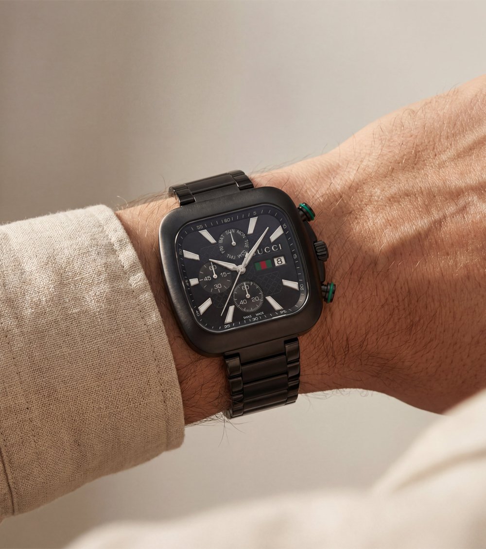 Green accent pushers on the side add a sporty edge, while the structured square design delivers a confident wrist presence. Built for men who prefer statement watches with luxury attitude, this timepiece blends fashion, functionality, and power in one design.