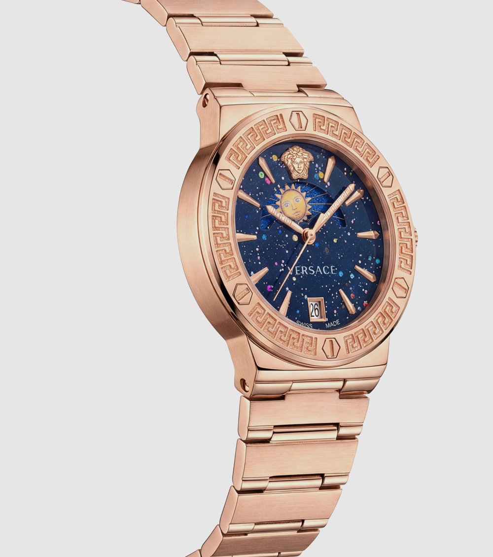 The engraved Greek-key bezel frames the dial with signature architectural detailing, while the integrated rose gold bracelet adds structure and strength to its silhouette. A date window at 6 oรขโฌโขclock provides functional balance without disturbing the visual harmony.