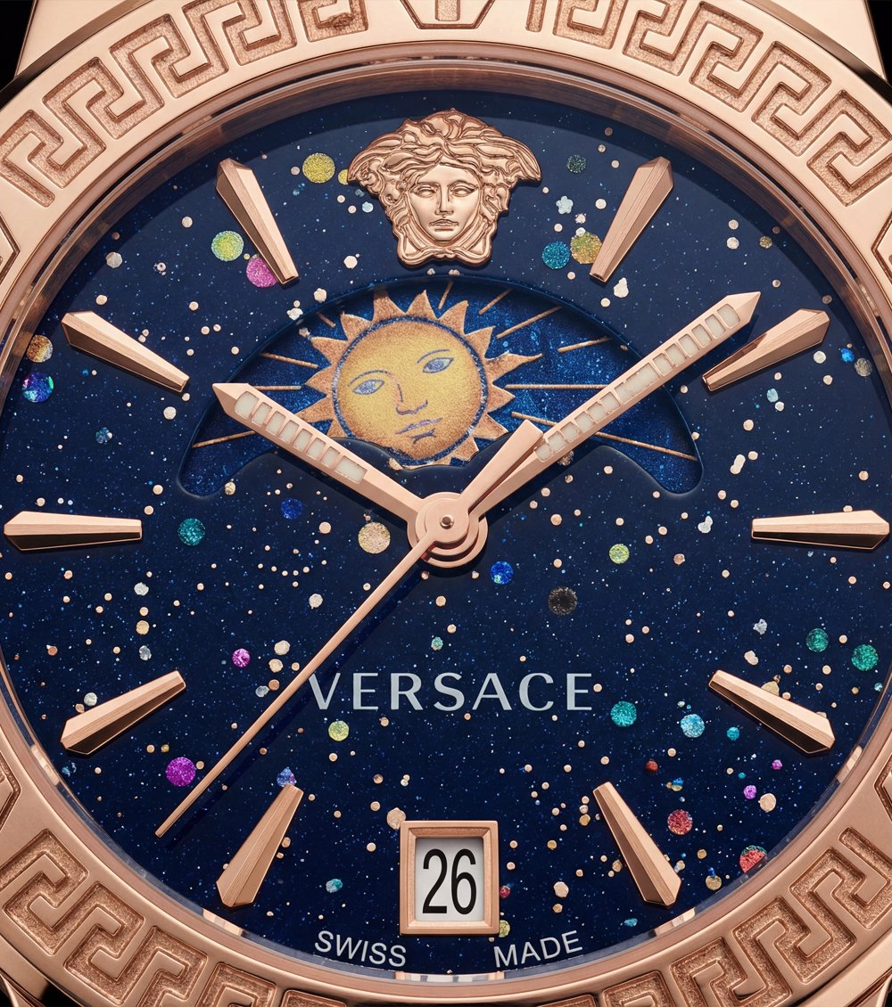 The dial features a galaxy-like speckled design enhanced with multicolor crystal accents, giving it dimension and artistic character. At the center, the powerful Medusa emblem rises beneath a radiant golden sun motif โ a symbol of heritage and unmistakable identity.