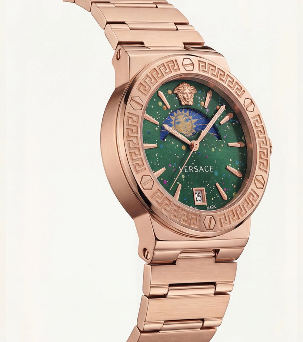 The engraved Greek-key bezel in matching rose gold frames the dial with architectural precision, adding signature detailing that instantly commands attention. A date window at 6 oรขโฌโขclock provides functional balance without interrupting the artistic layout.