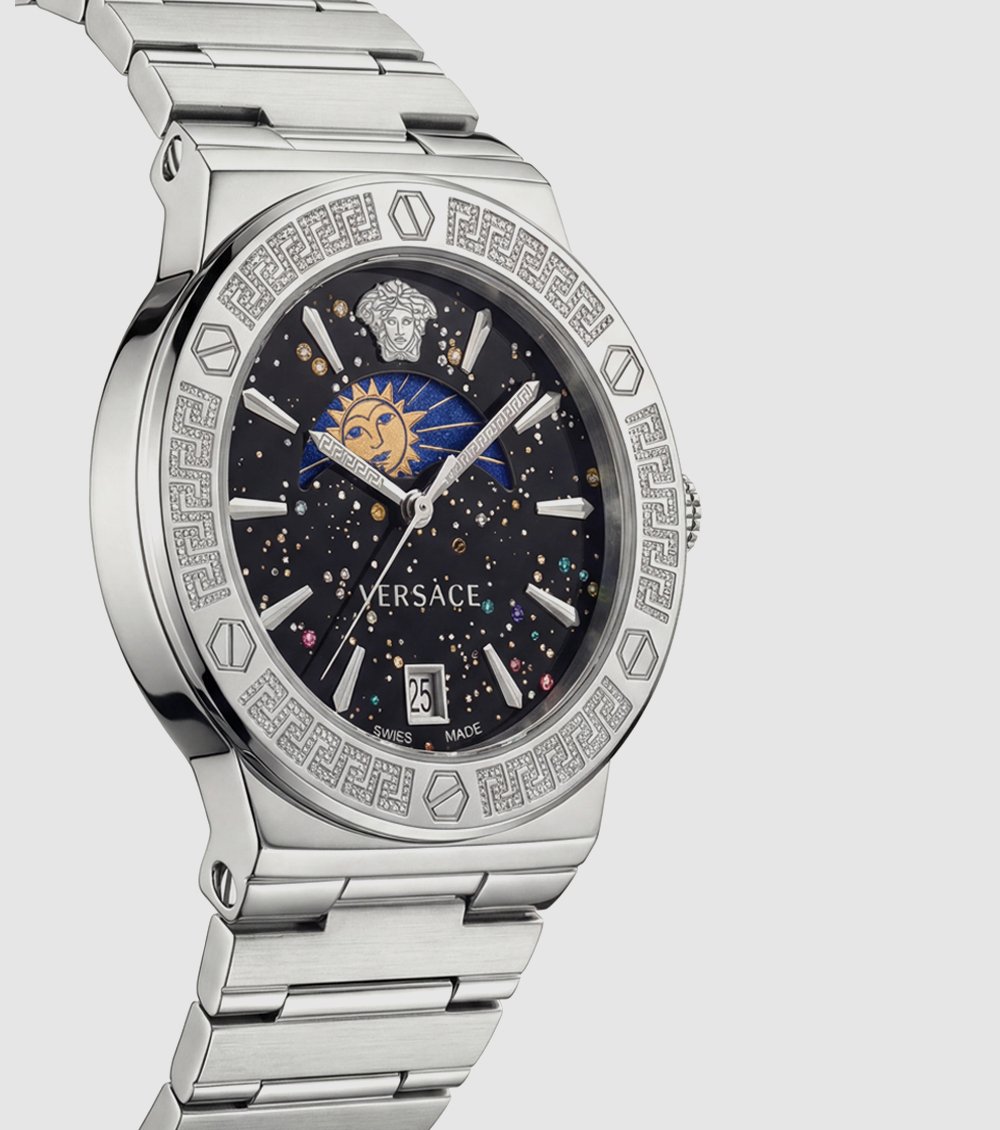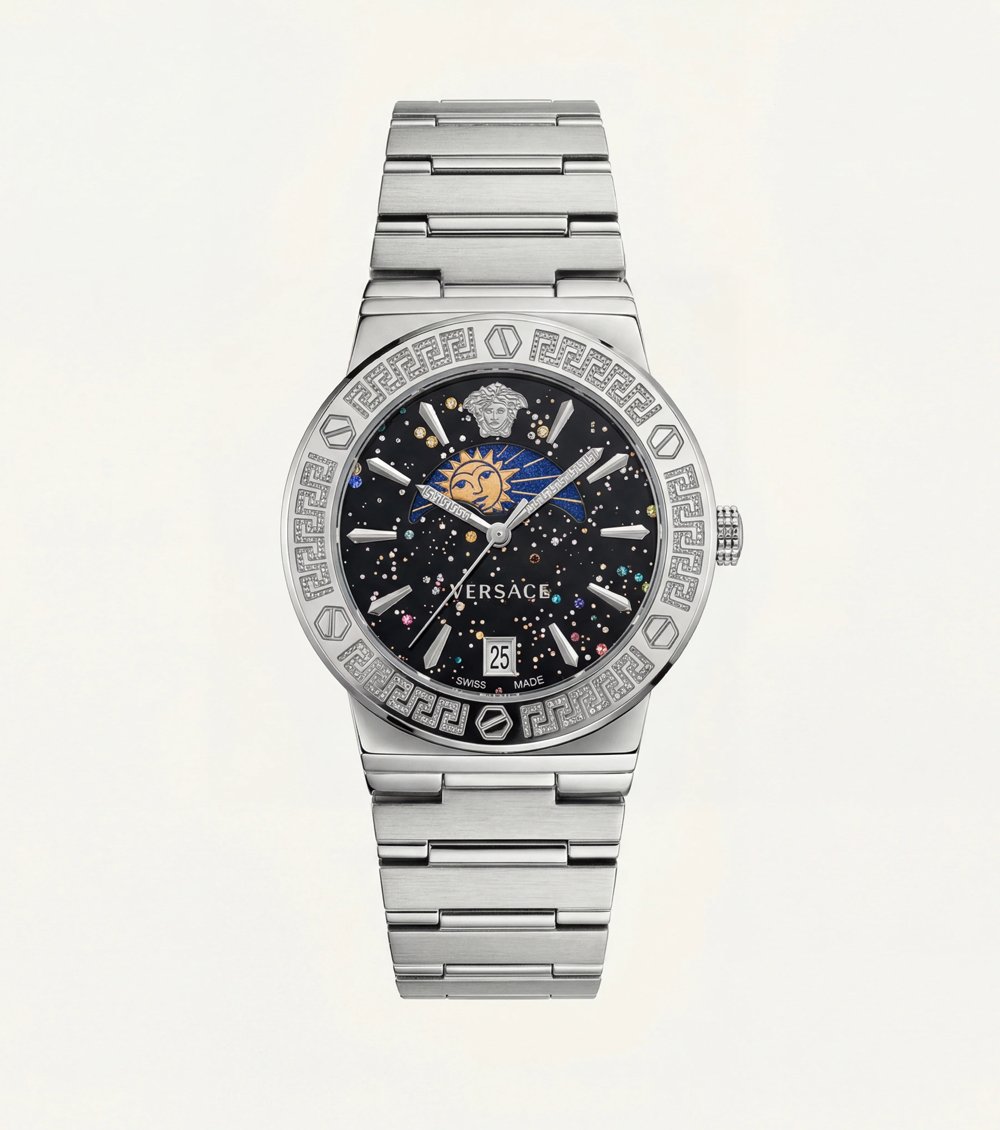 At the center, the powerful Medusa emblem sits beneath a golden sun motif โ a symbol of heritage and unmistakable identity. The engraved Greek-key bezel frames the dial with sharp architectural precision, reinforcing its iconic character.