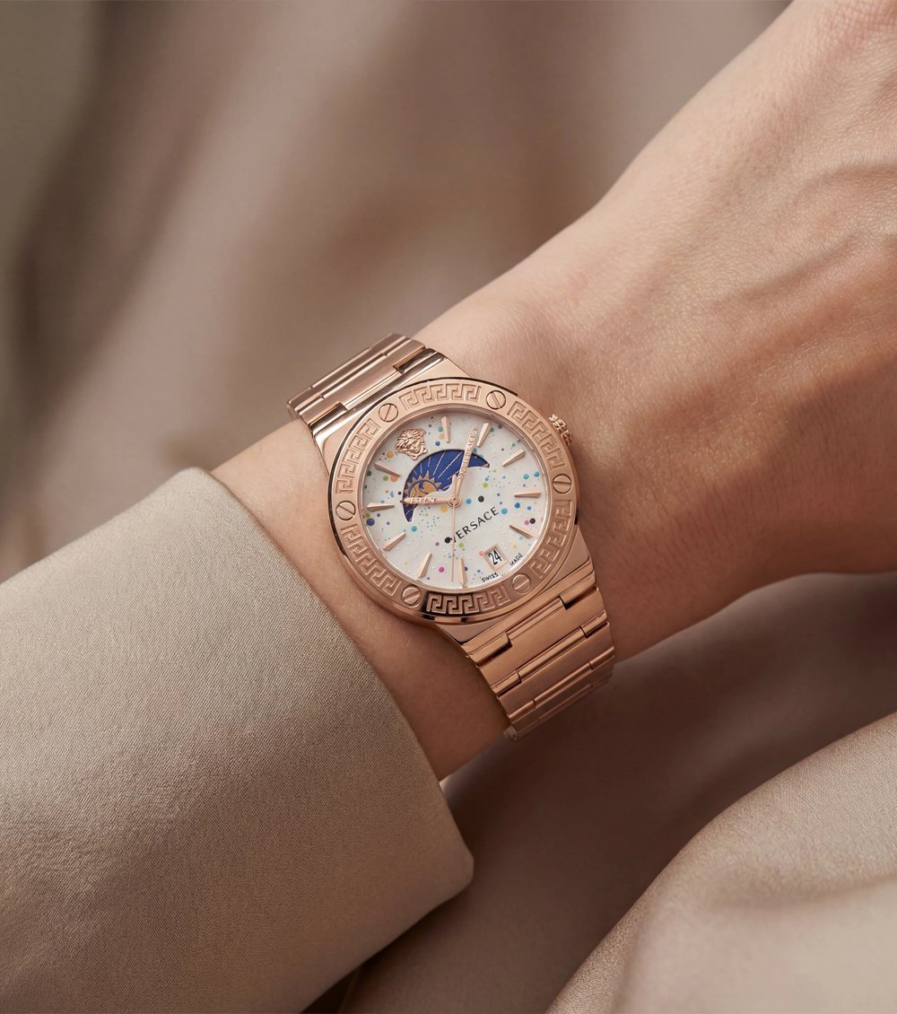 The engraved Greek-key bezel in matching rose gold frames the dial with bold architectural symmetry, reinforcing its unmistakable heritage design. A date window at 6 oรขโ‚ฌโ„ขclock provides functional precision while maintaining perfect visual balance.