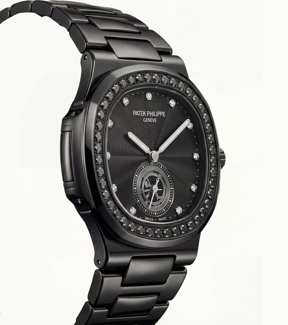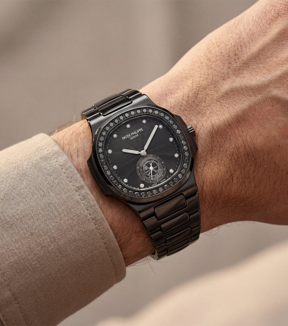 A black-toned case and matching solid bracelet create a bold monochrome look, while the stone-set bezel adds a subtle touch of glamour without overpowering the design. Perfect for formal wear, evening occasions, or anyone who prefers understated luxury with a modern edge.