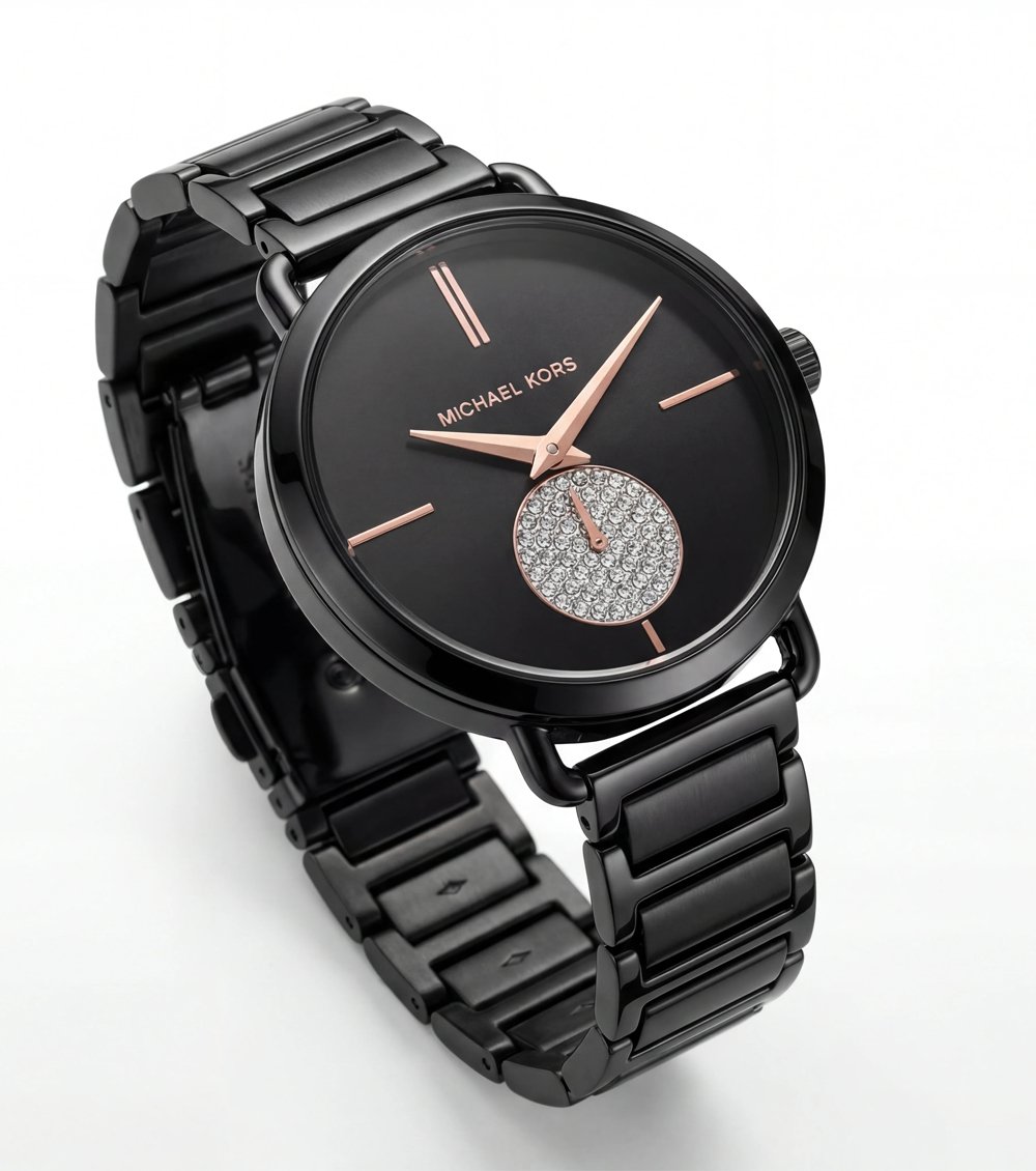 Rose gold-tone hands and slim index markers bring warmth and sophistication, standing out elegantly against the deep black backdrop. At the 6 oรขโฌโขclock position, a crystal-paved subdial introduces a subtle touch of brilliance โ offering refined glamour without overpowering the clean design.