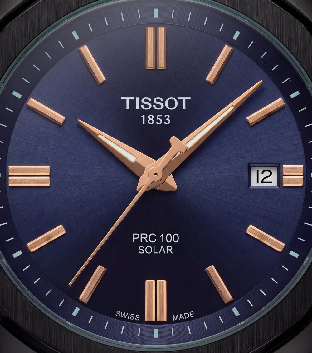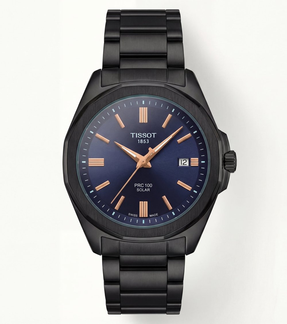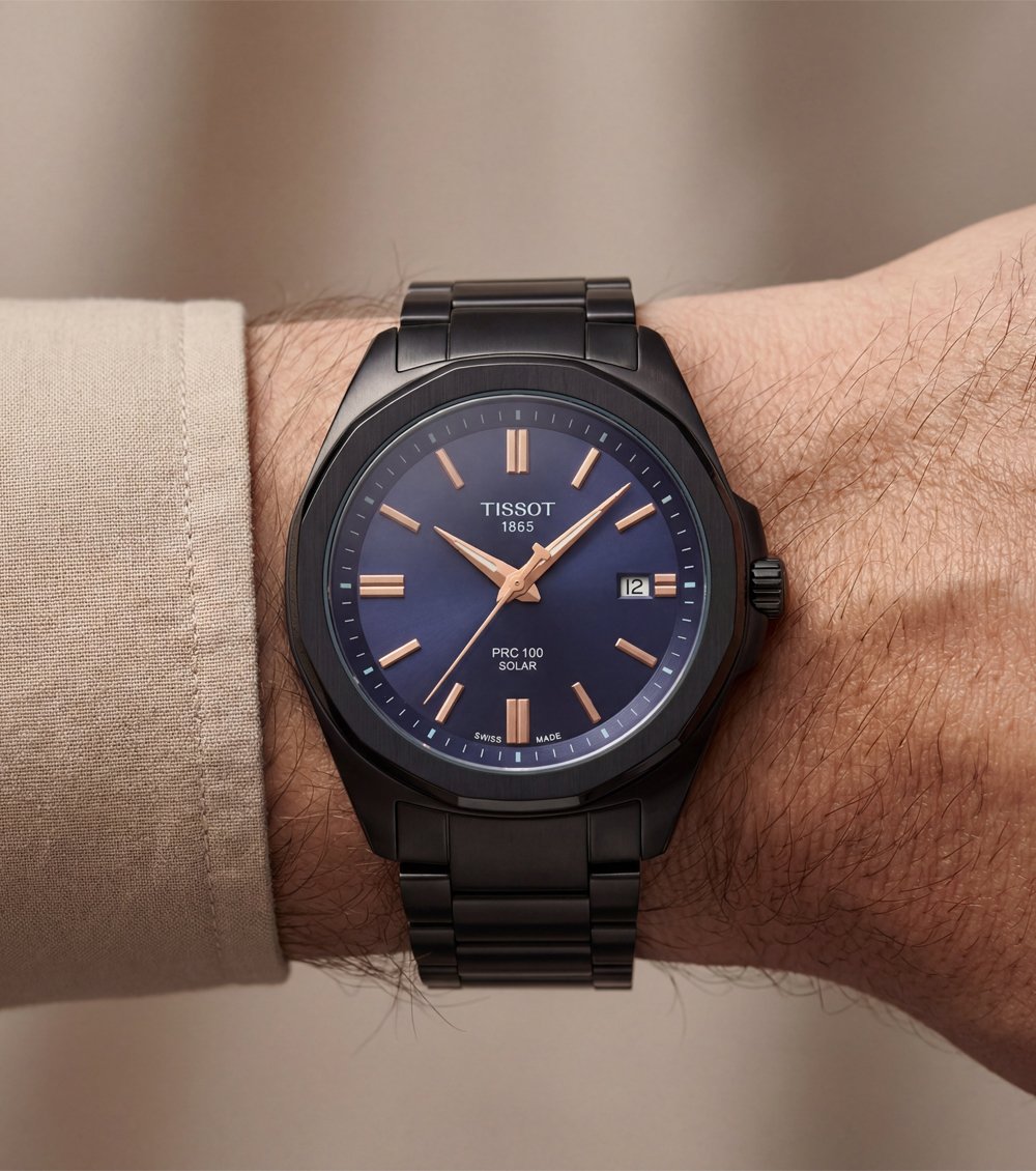 This refined solar-powered dress watch features a sleek matte black stainless steel case paired with a solid integrated bracelet, creating a bold yet elegant wrist presence. The deep midnight blue dial adds richness and depth, while gold-tone hour markers and hands provide a striking contrast for clear readability.