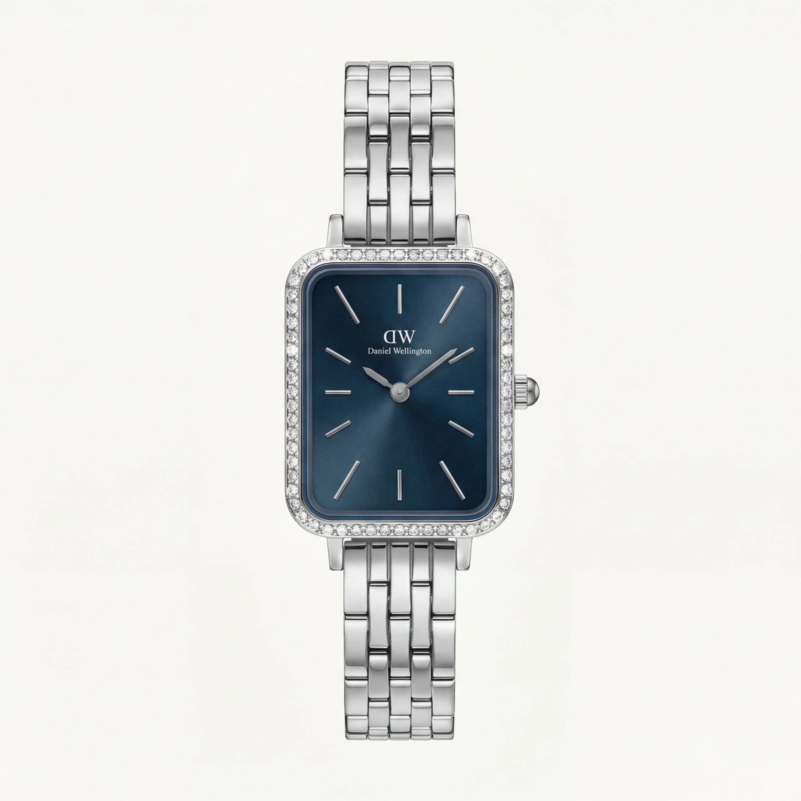 Encased in a polished silver-tone rectangular frame lined with delicate crystals, the watch delivers graceful brilliance without overwhelming its minimalist identity. The slim silver baton markers and sleek hands maintain a clean, balanced aesthetic.