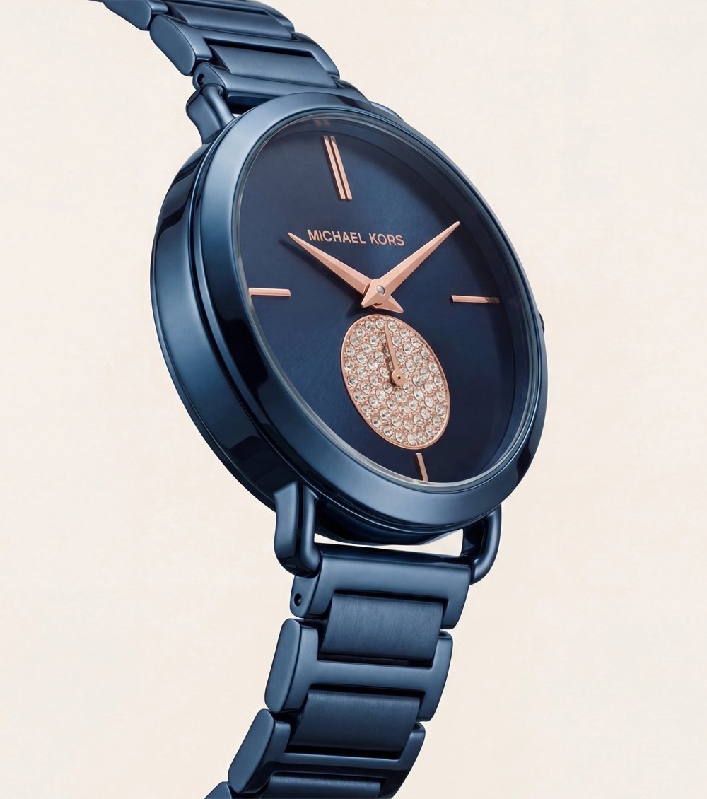 Rose gold-tone hands and minimalist index markers introduce a warm contrast against the cool blue base, elevating the overall aesthetic. At the 6 oรขโฌโขclock position, a crystal-paved subdial adds a touch of glamour and sparkle, delivering a subtle luxury detail without compromising the clean design language.
