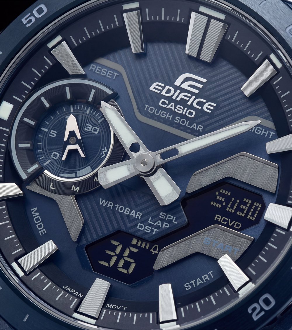The multi-layered blue dial combines analog hands with digital displays for maximum functionality and precision. Bold applied hour markers and luminous hands ensure excellent visibility, while the detailed sub-dials and digital readouts provide enhanced timing and utility features. The minute-marked bezel reinforces its sporty, instrument-inspired character.