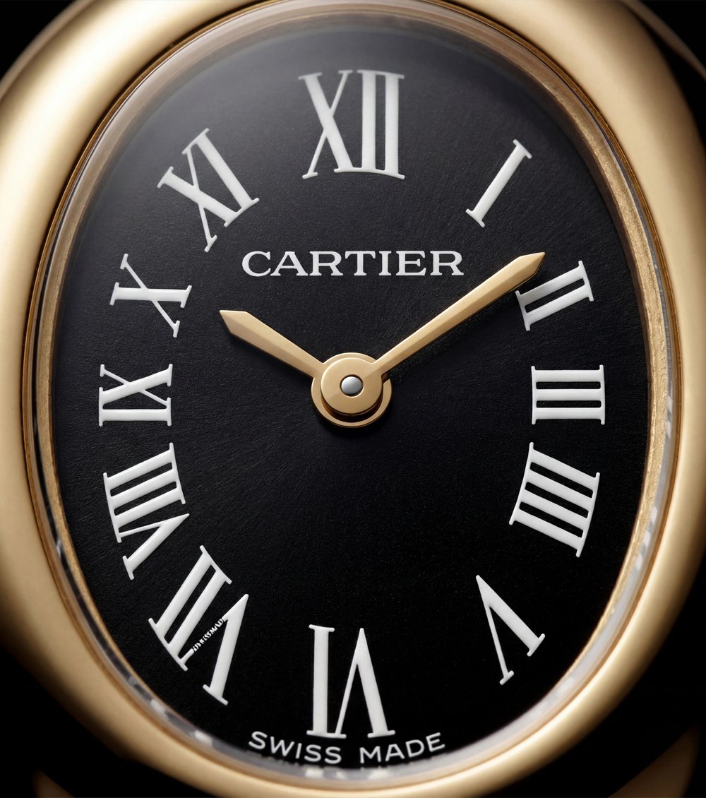 Gracefully arched Roman numerals enhance the oval silhouette, preserving traditional refinement while offering a striking visual balance. The gold-tone hands blend seamlessly into the case aesthetic, maintaining a clean, sophisticated look.