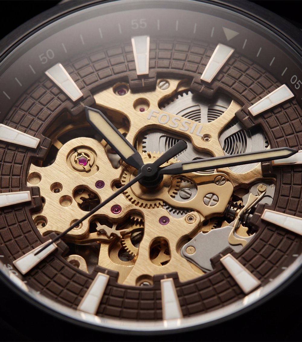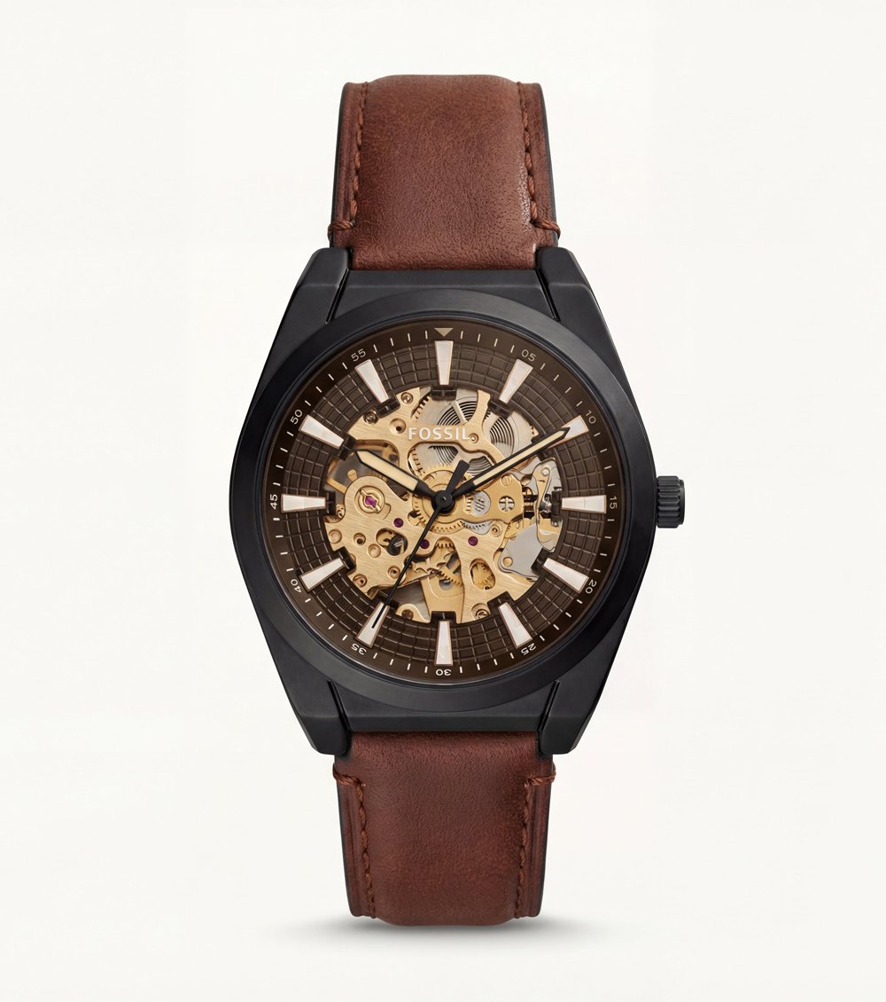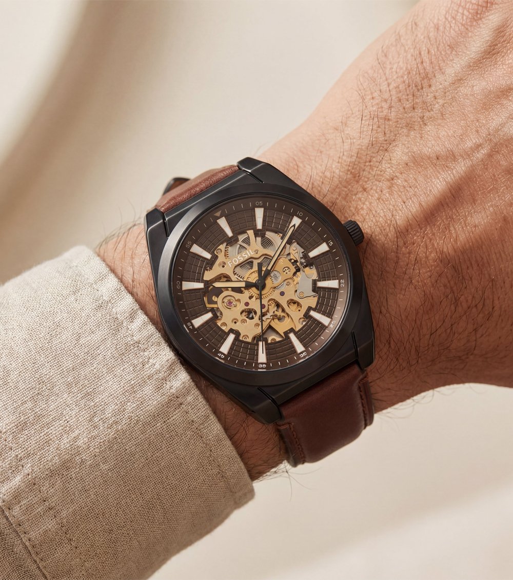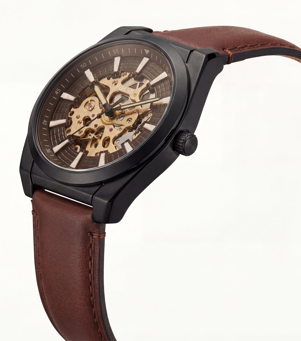 Finished with a rich brown leather strap, this timepiece provides a comfortable fit and a refined contrast against the dark case. Designed for those who appreciate visible mechanics, confident design, and modern craftsmanship, it pairs effortlessly with casual outfits, smart wear, and evening looks.