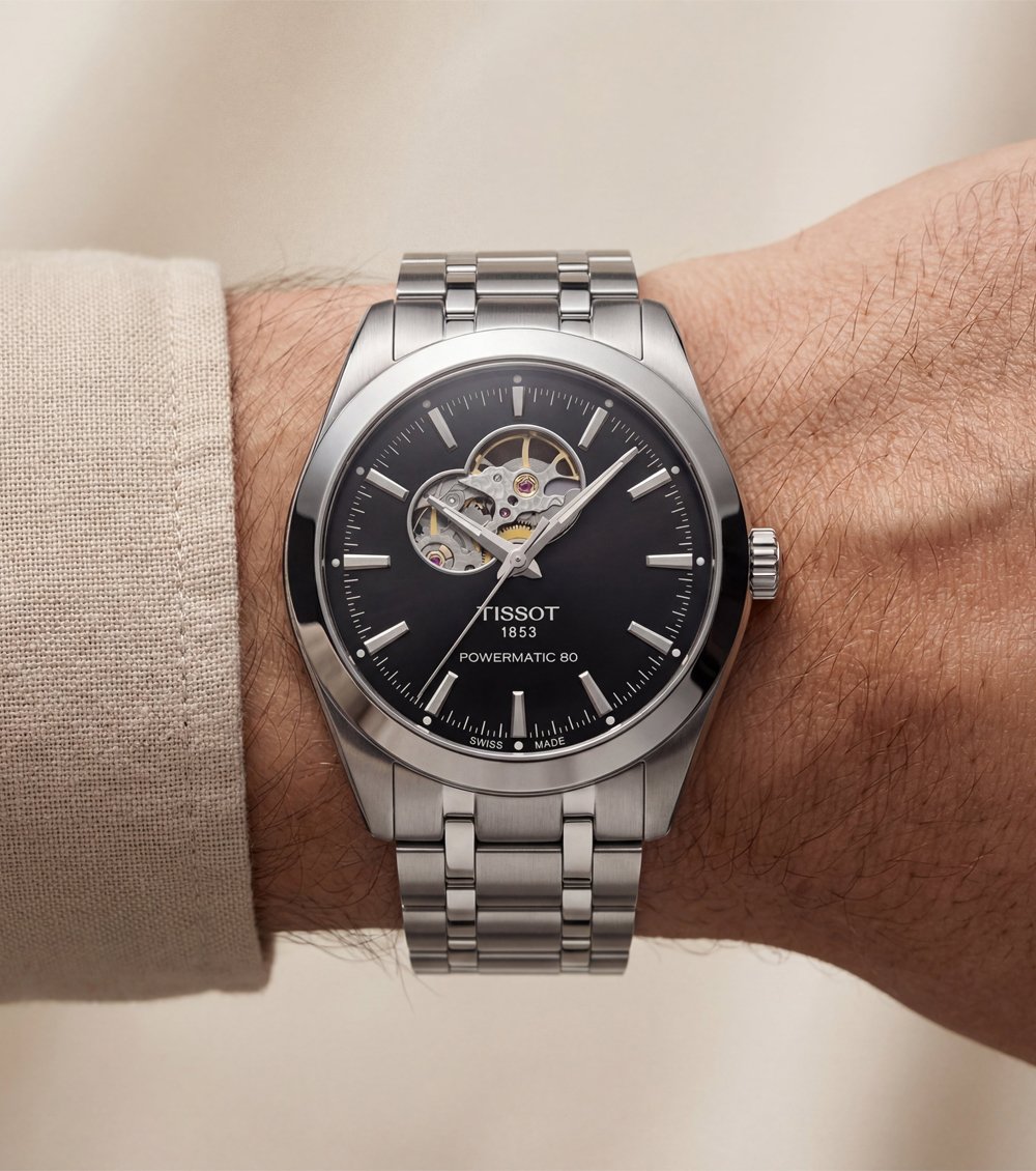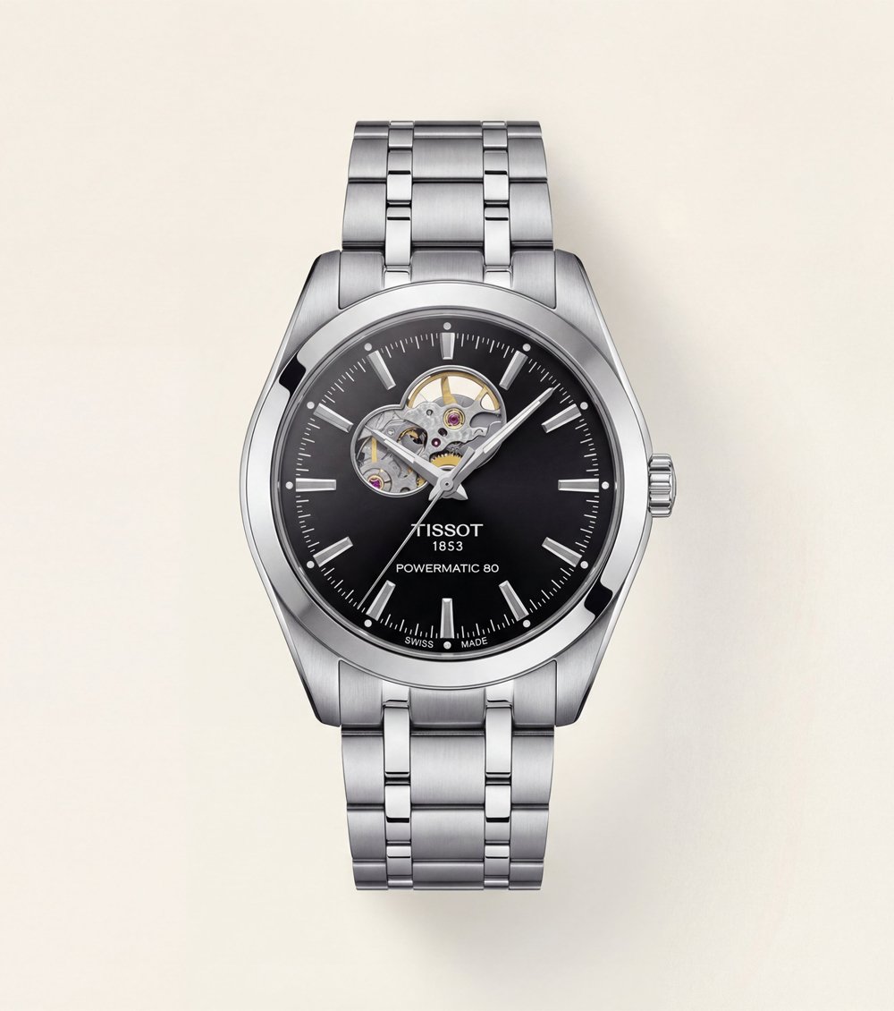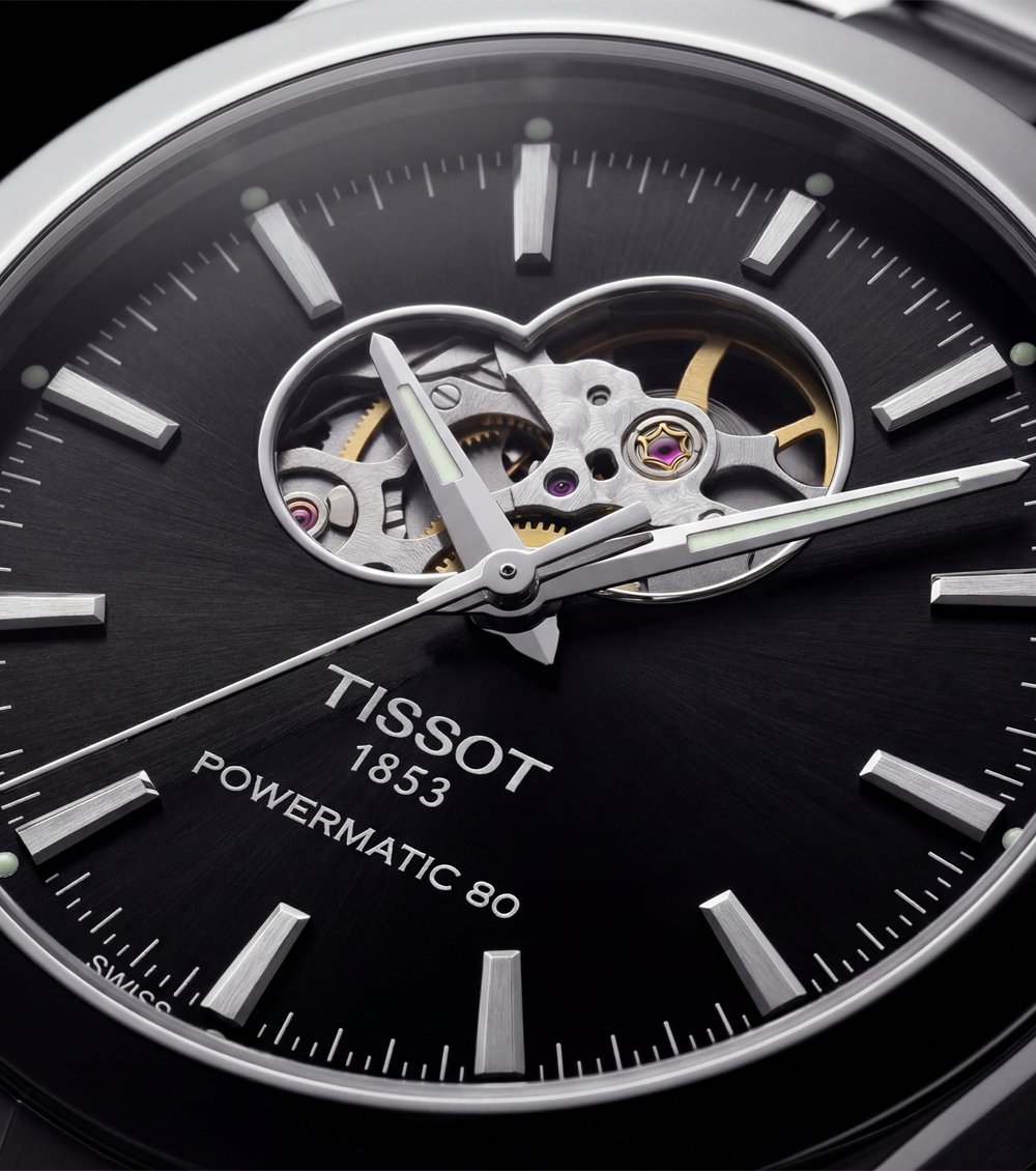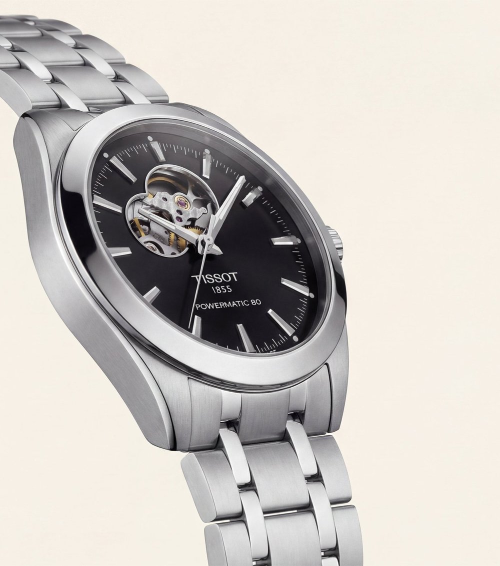 This sophisticated automatic watch features a deep black dial paired with an elegant open-heart design, delivering a bold yet refined wrist presence. The exposed mechanical window highlights the movement in motion, adding depth and character while preserving a clean, balanced layout.