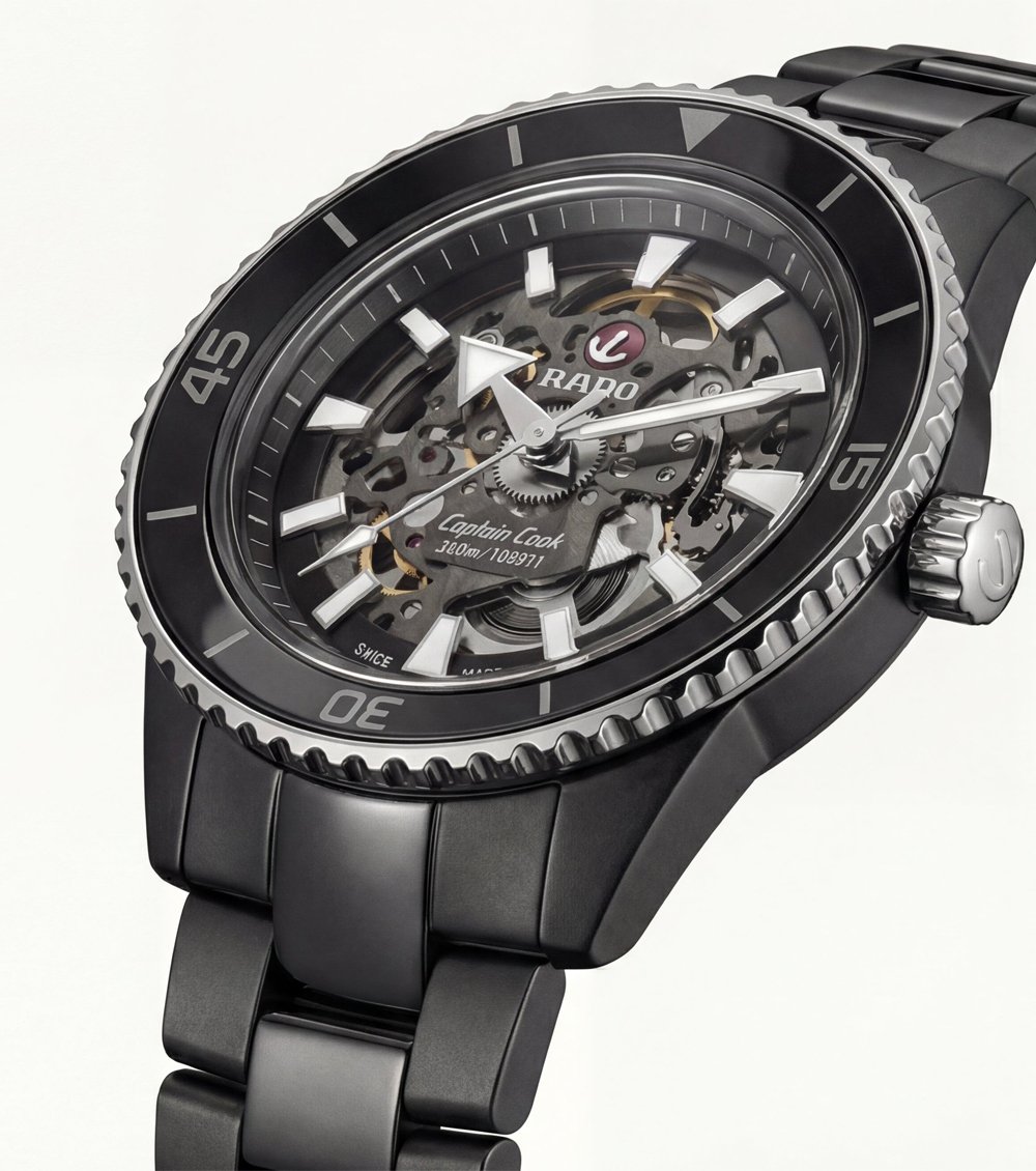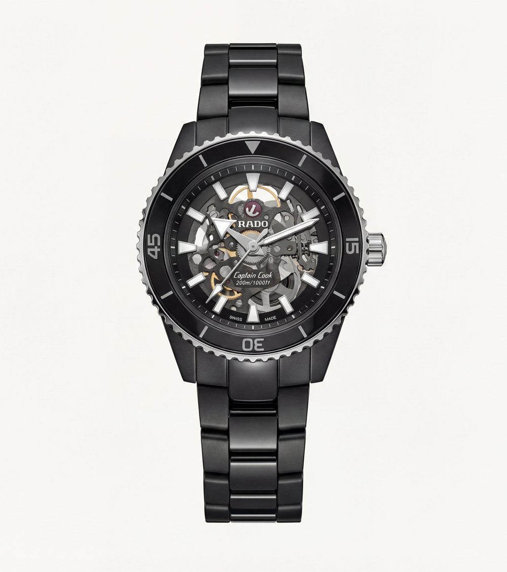 This bold automatic timepiece features a deep obsidian-black finish paired with a fully exposed skeleton dial, delivering a powerful and modern wrist presence. The open-worked dial reveals the intricate mechanical movement beneath, creating depth, motion, and a true mechanical character inspired by professional dive styling