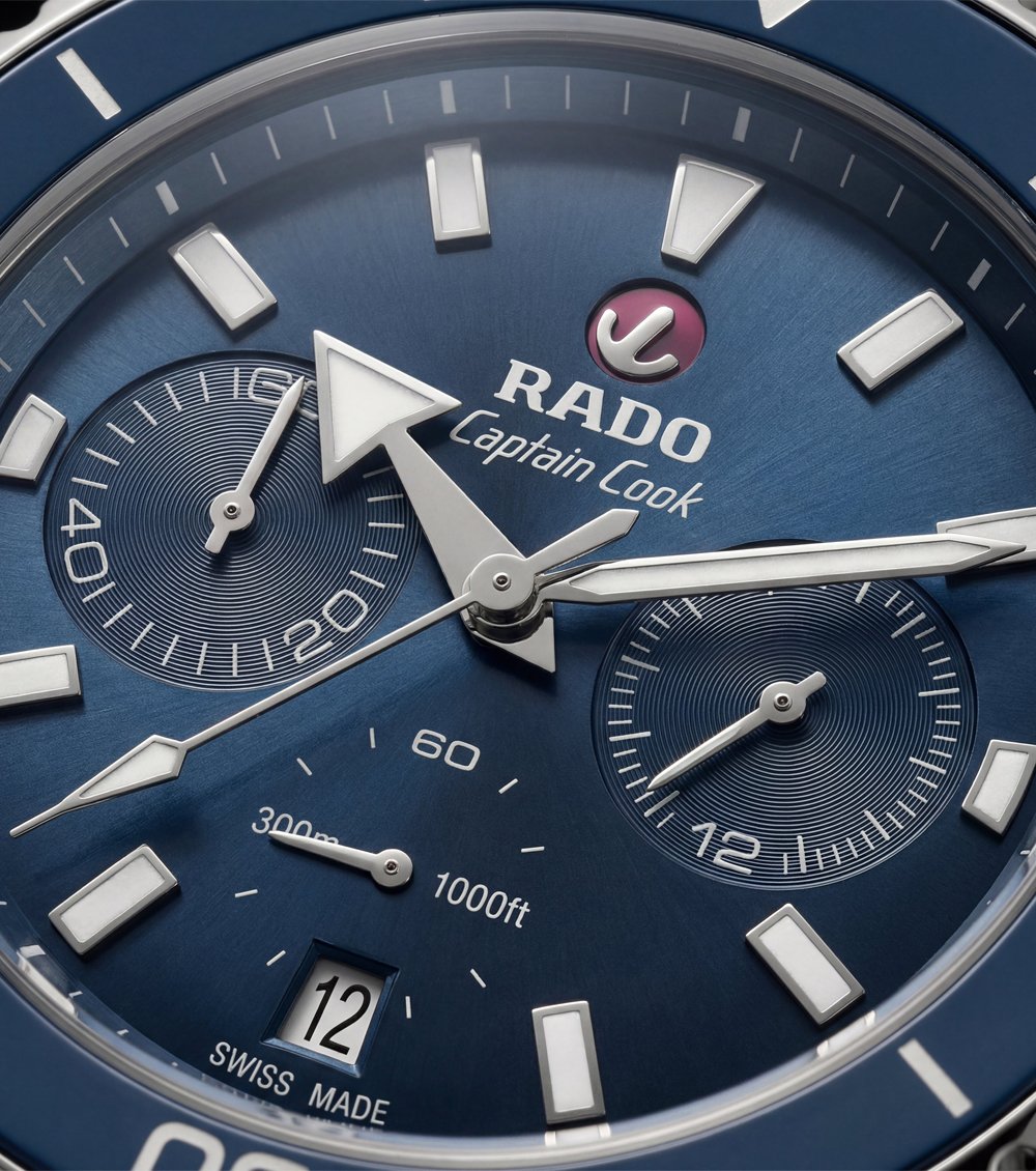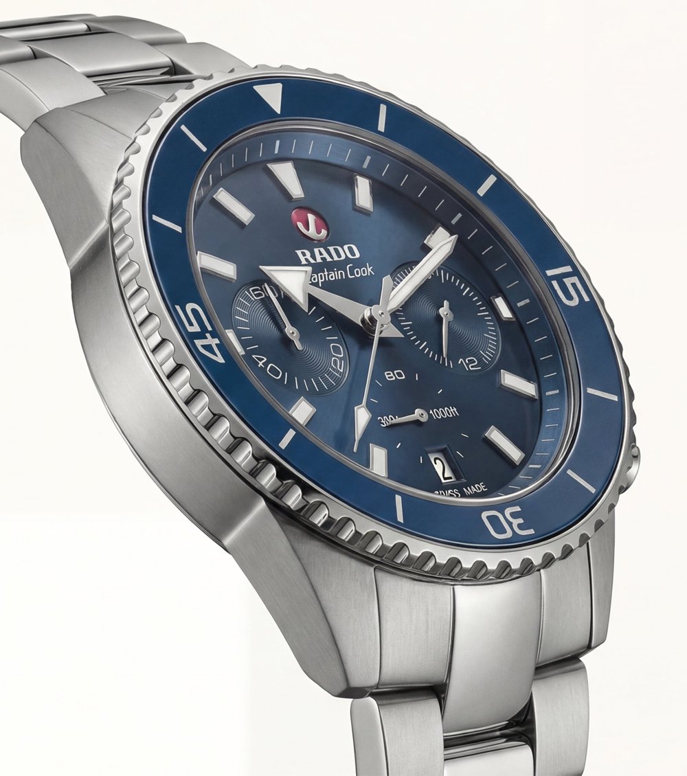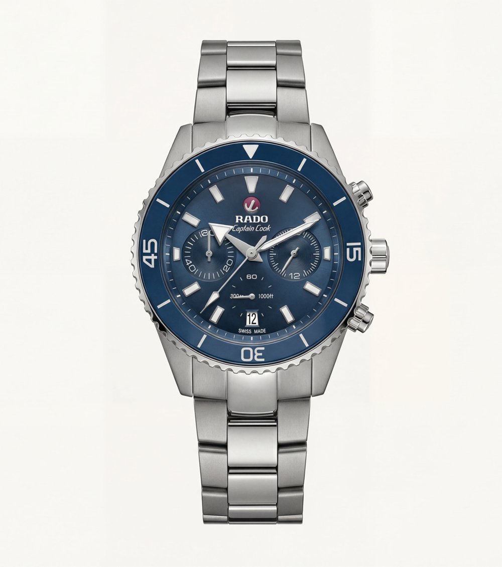 This powerful automatic diver chronograph features a bold round stainless steel case paired with a solid integrated bracelet, delivering a strong and confident sports-luxury presence. The deep ocean-blue dial and matching diver bezel create a striking visual impact, while luminous hour markers and hands ensure excellent readability in all lighting conditions.