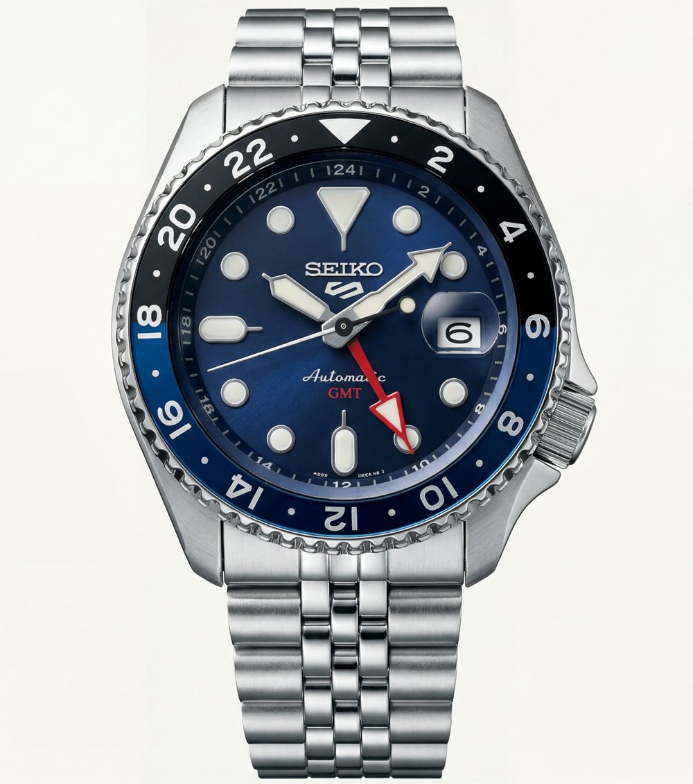 This bold automatic GMT watch features a deep ocean-blue dial paired with a bi-directional 24-hour bezel, delivering a sporty and travel-ready wrist presence. The contrasting blue and black bezel insert enhances readability while adding a dynamic, modern edge to the overall design.