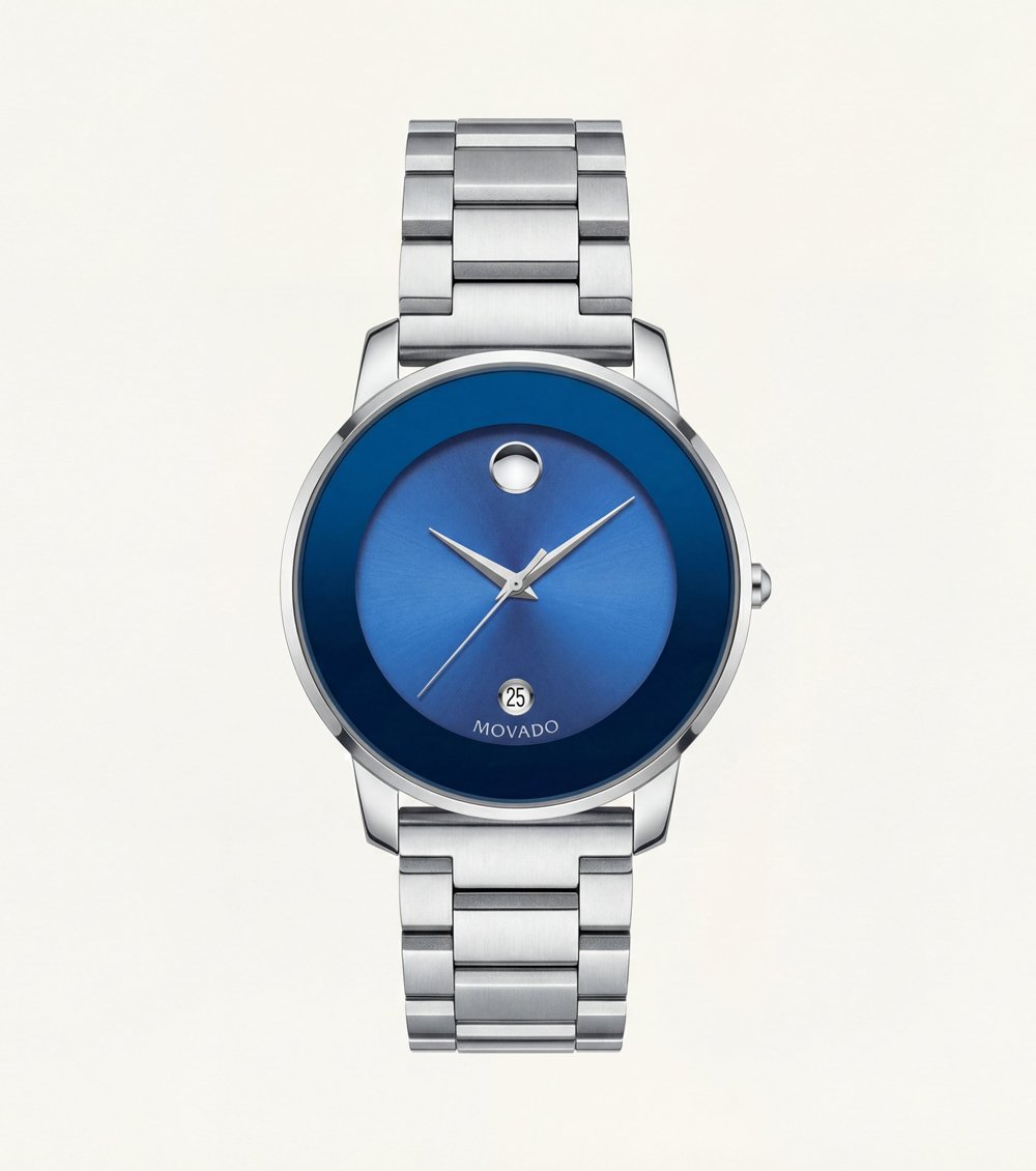 This elegant Men’s watch showcases a rich ocean blue sunburst dial paired with a clean silver stainless steel case and bracelet. The iconic single dot hour marker and slim silver hands create a refined minimalist design that stands out with subtle luxury.