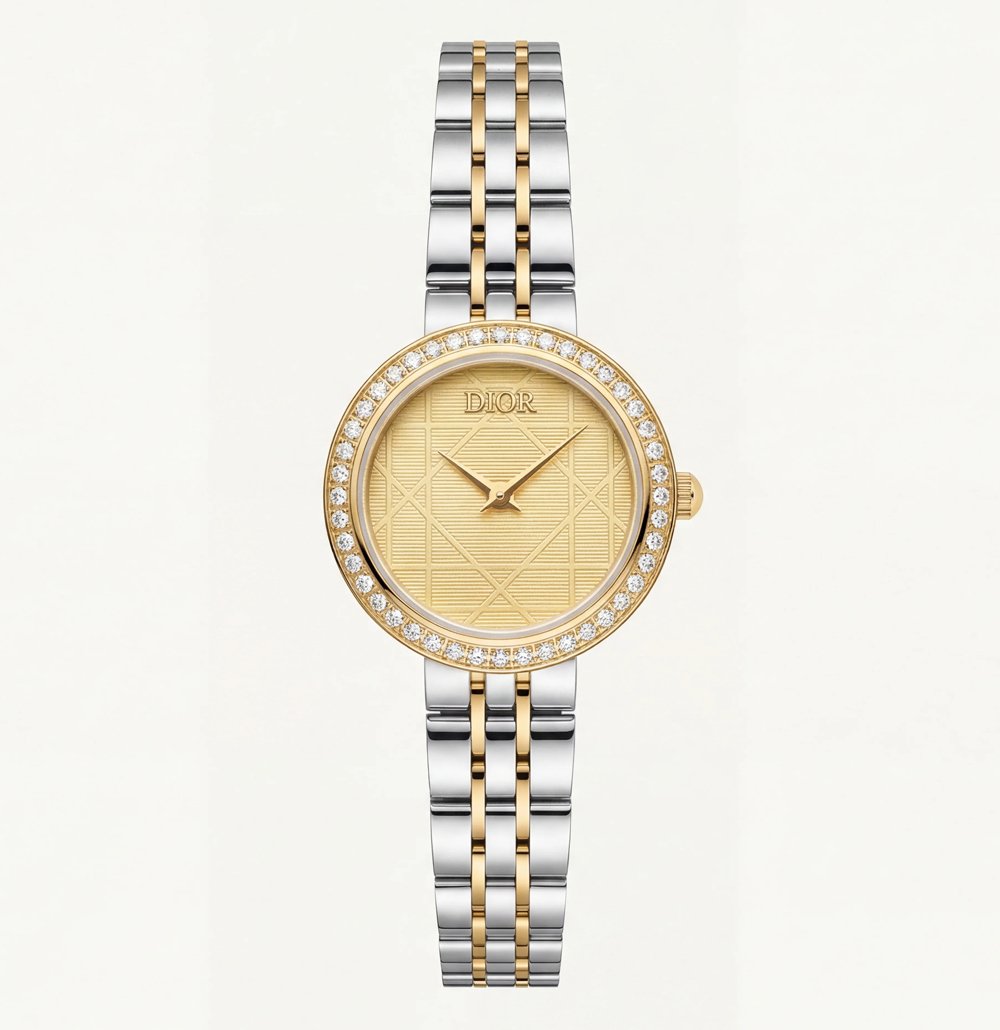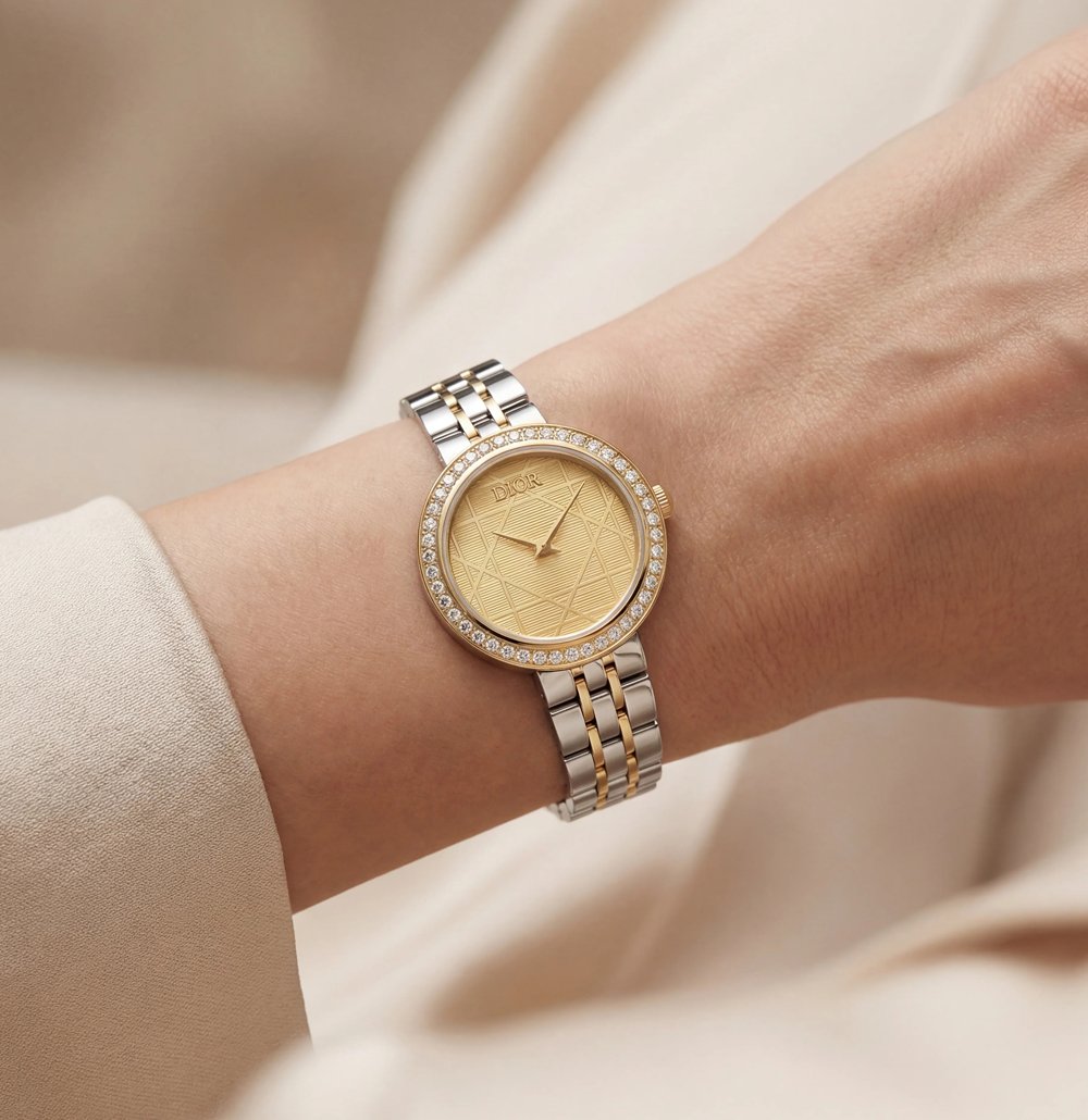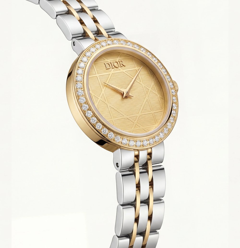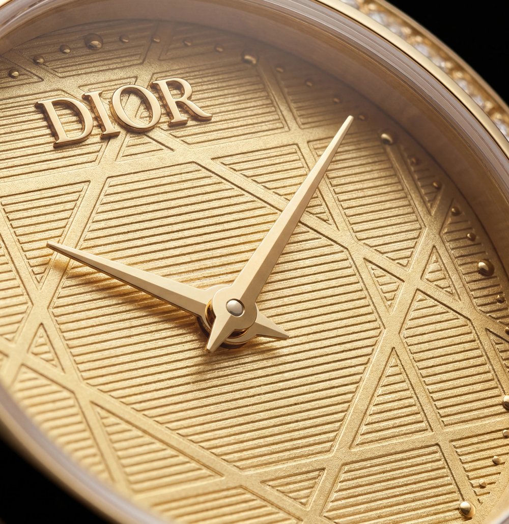 The gold dial showcases Diorรขโฌโขs signature geometric couture motif, creating depth and architectural symmetry. Matching gold-tone hands glide seamlessly across the textured surface, reinforcing its monochromatic sophistication.