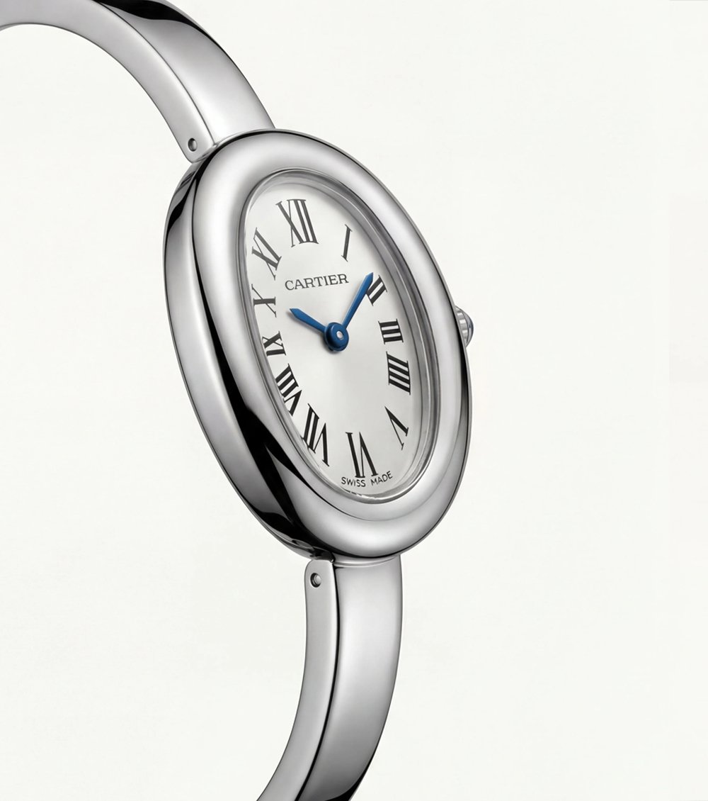 The clean white dial features bold Roman numerals and elegant blue sword-style hands โ a timeless combination that reflects heritage luxury. The minimalist two-hand display keeps the design uncluttered, allowing the oval silhouette to remain the true statement.