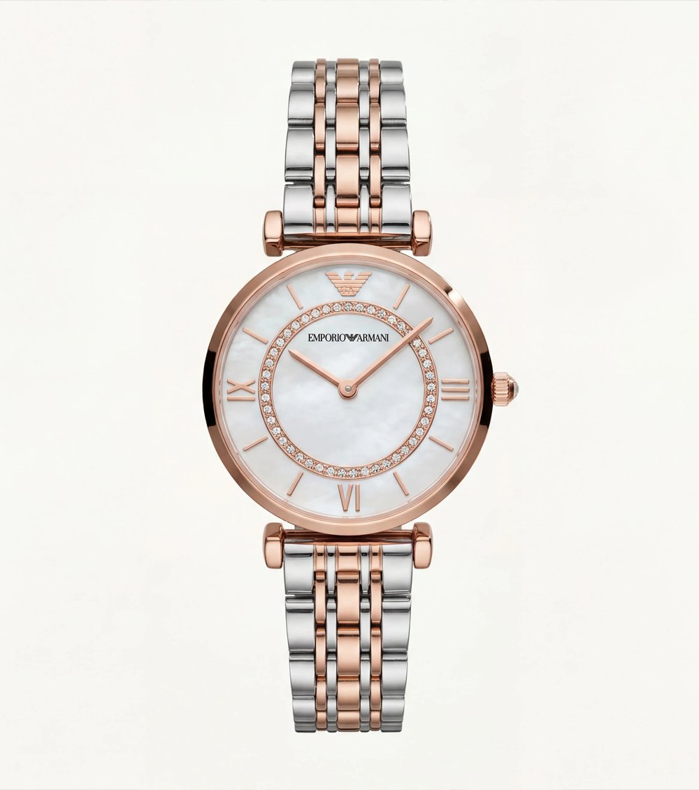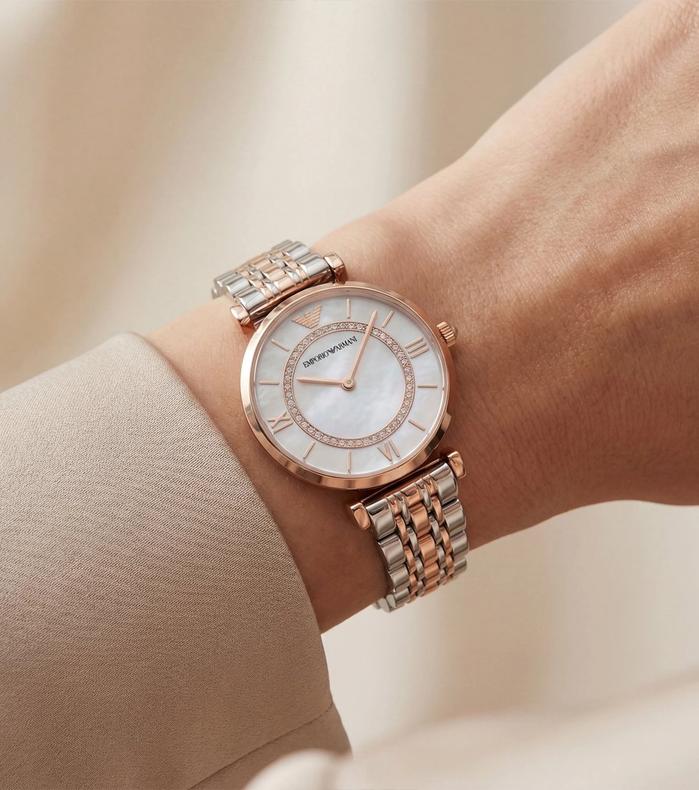This two-tone luxury watch is crafted for women who appreciate delicate detail and graceful design. The luminous mother-of-pearl dial reflects light with a natural iridescent glow, creating a refined and feminine presence.