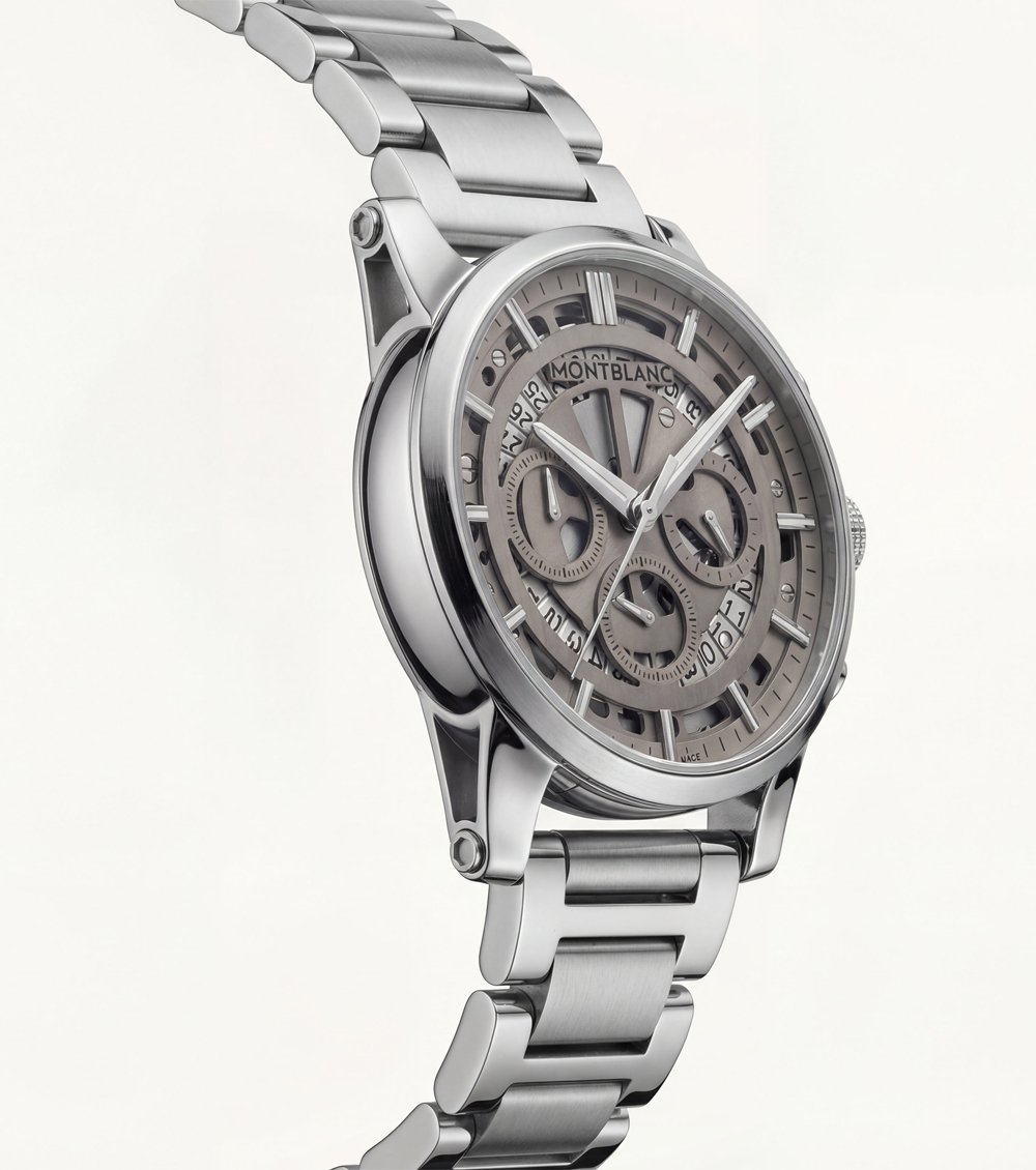 This premium skeleton chronograph watch showcases an intricate open-work dial that reveals its mechanical-inspired design. The silver-tone stainless steel case and bracelet give it a bold luxury appeal, while multiple sub-dials add precision timekeeping functionality.