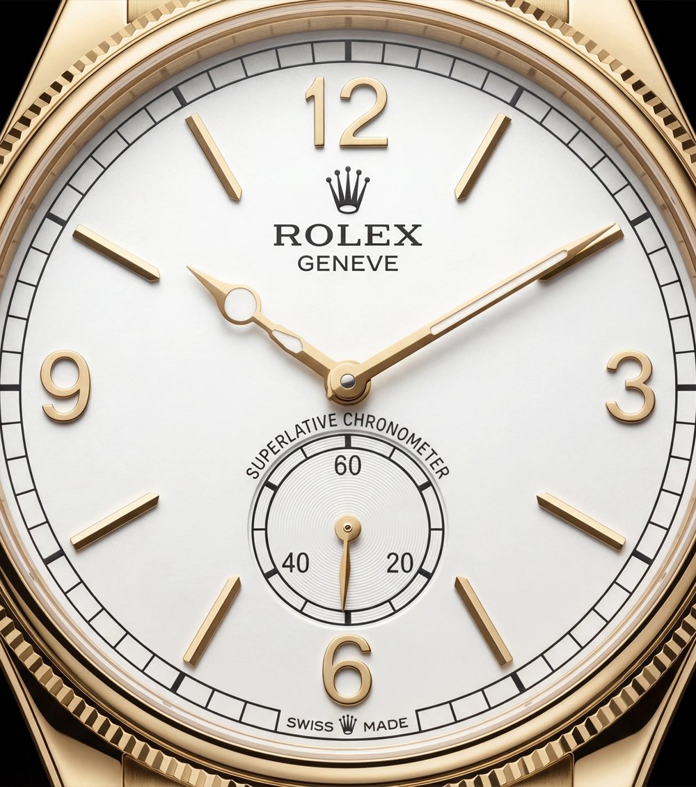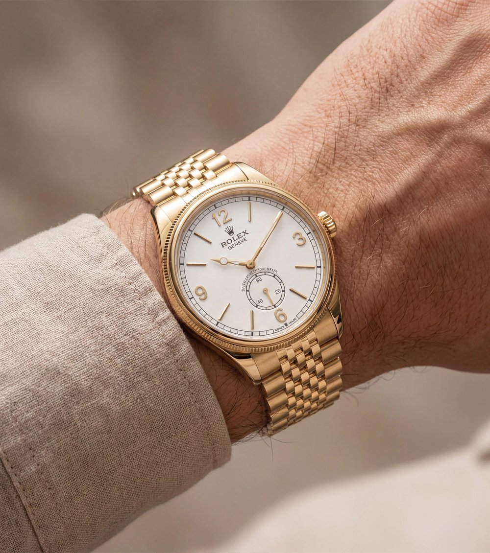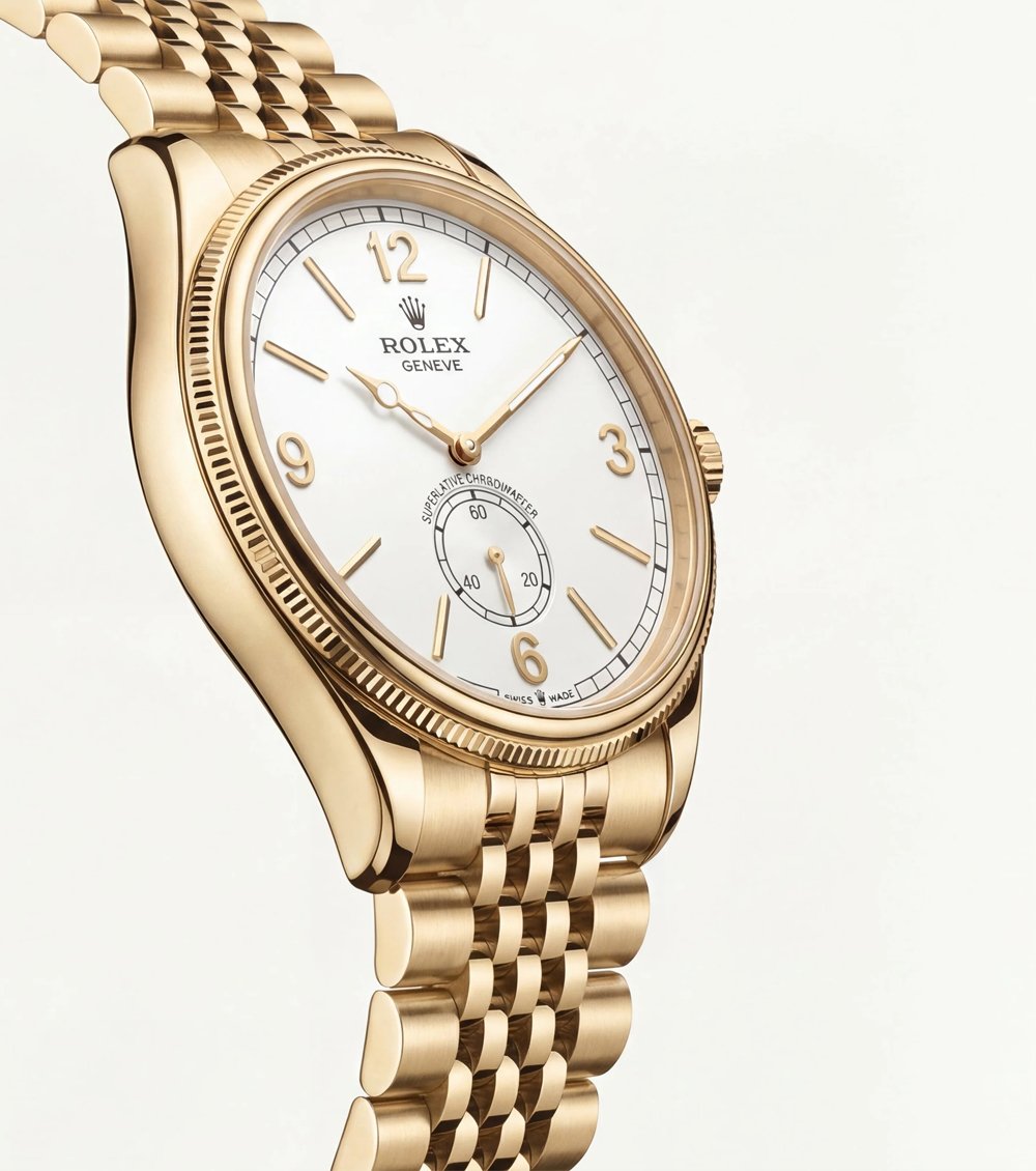 R0LEX Heritage Gold Small Seconds Automatic Watch ek timeless luxury timepiece hai jo classic elegance aur refined craftsmanship ko perfectly blend karta hai. Warm gold-tone case aur matching bracelet watch ko royal presence dete hain, jabki clean ivory dial traditional watchmaking aesthetics ko highlight karta hai. Arabic numerals aur applied gold hour markers dial ko balanced aur sophisticated look dete hain.