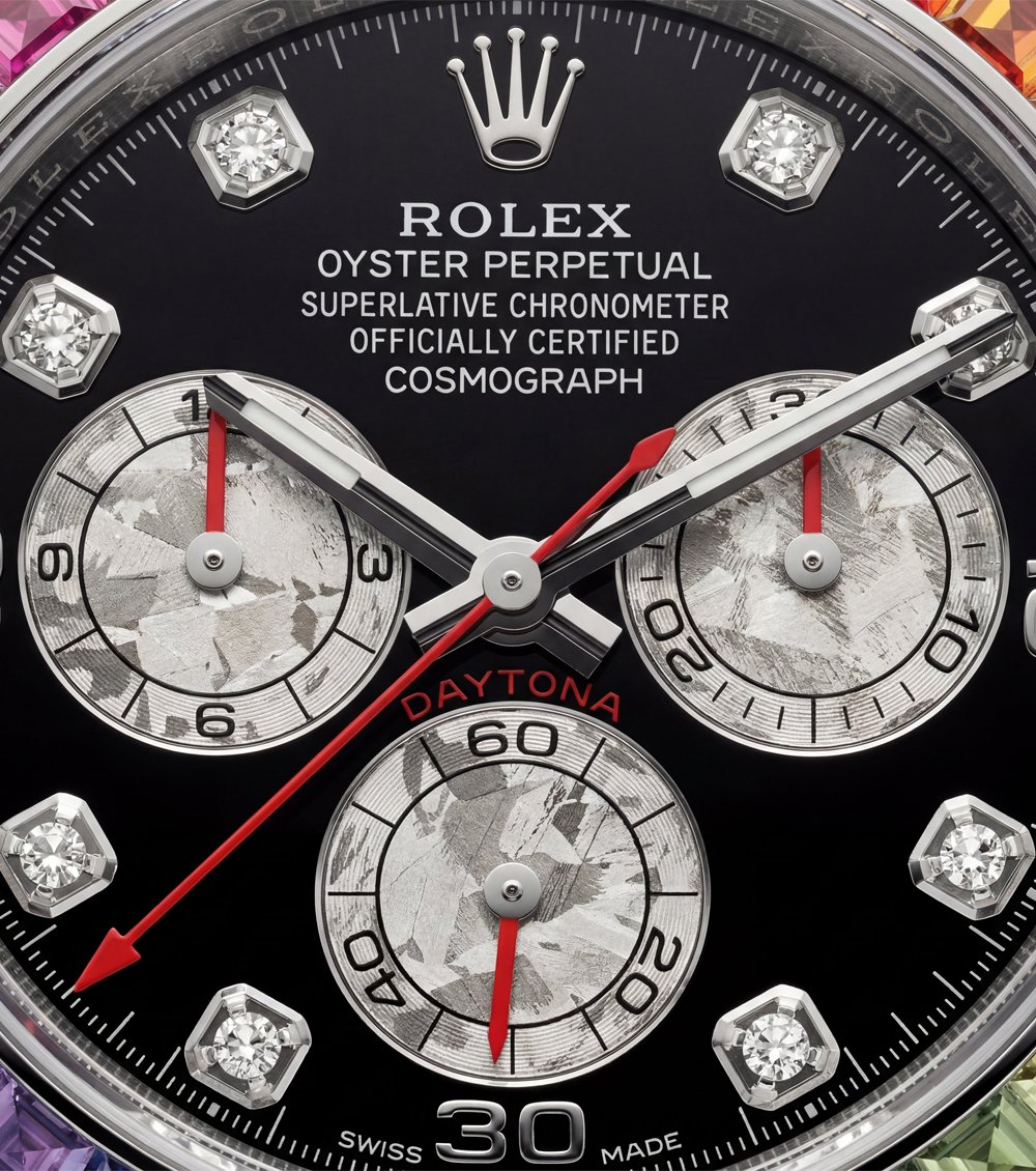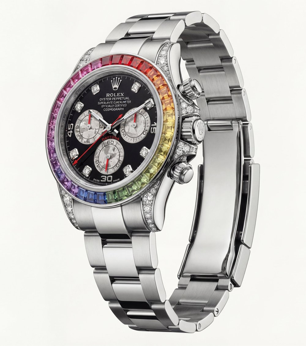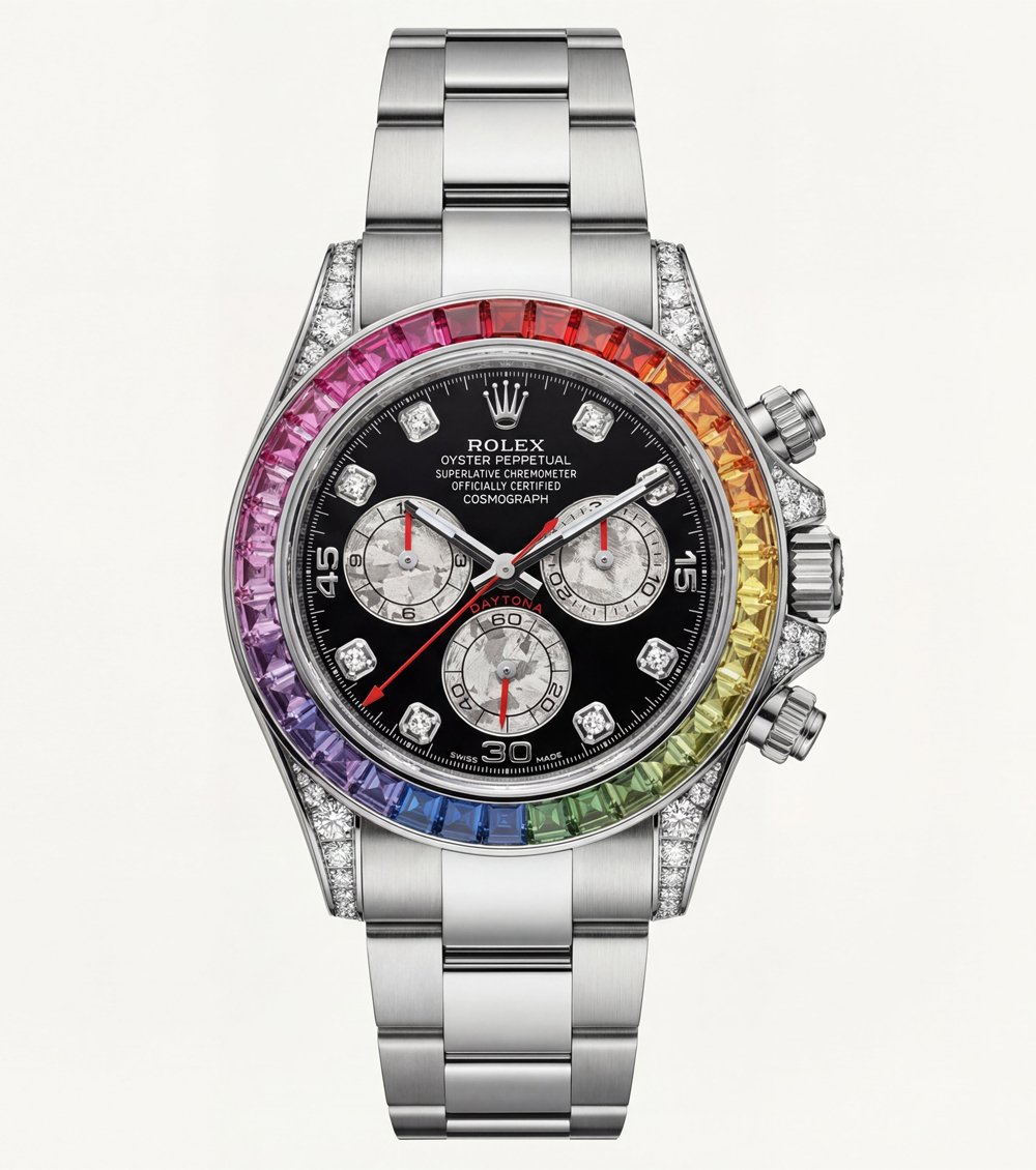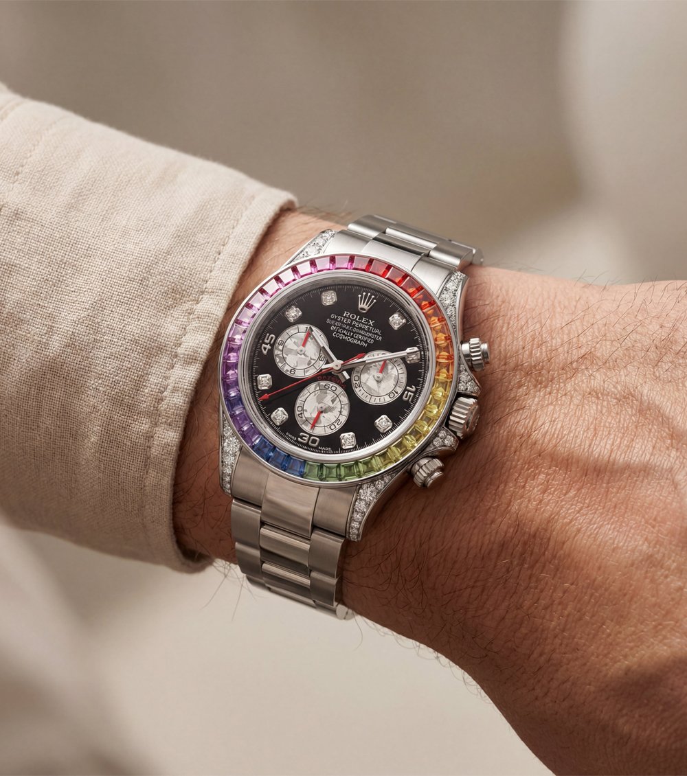 This statement luxury chronograph watch features an eye-catching rainbow gemstone bezel paired with a deep black dial, creating a powerful contrast of elegance and bold design. Precision-cut multicolor stones surround the case, adding a vibrant spectrum effect that instantly elevates wrist presence.
