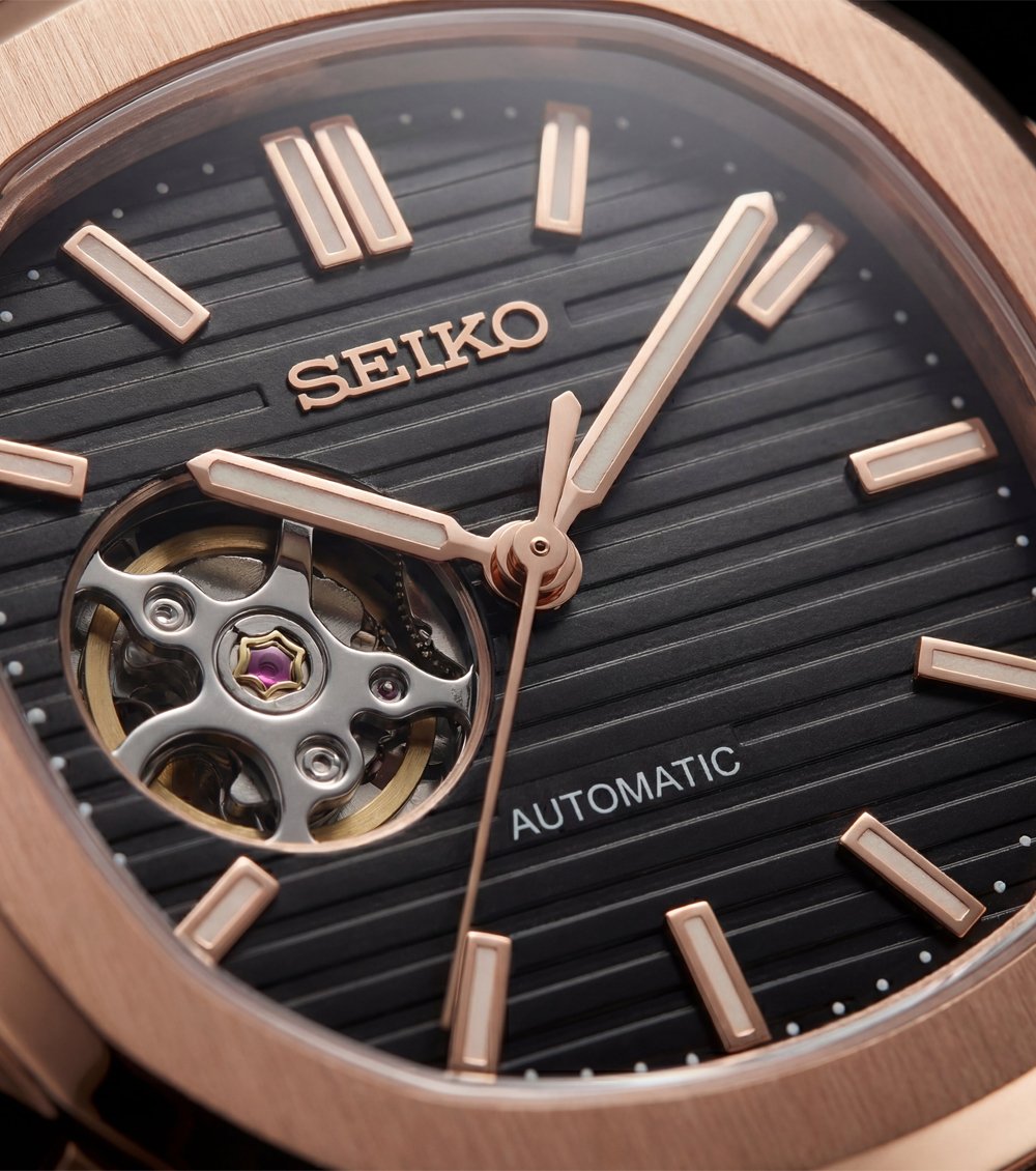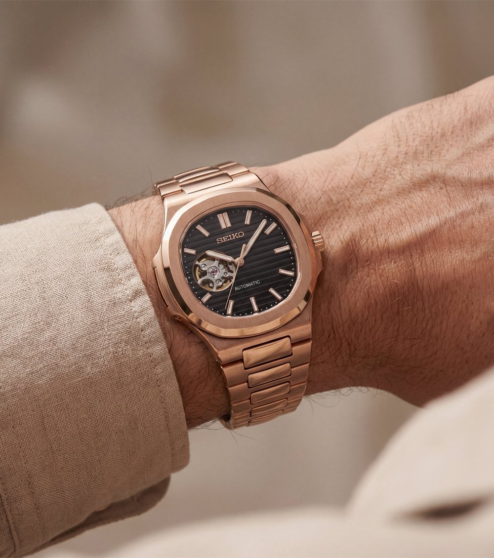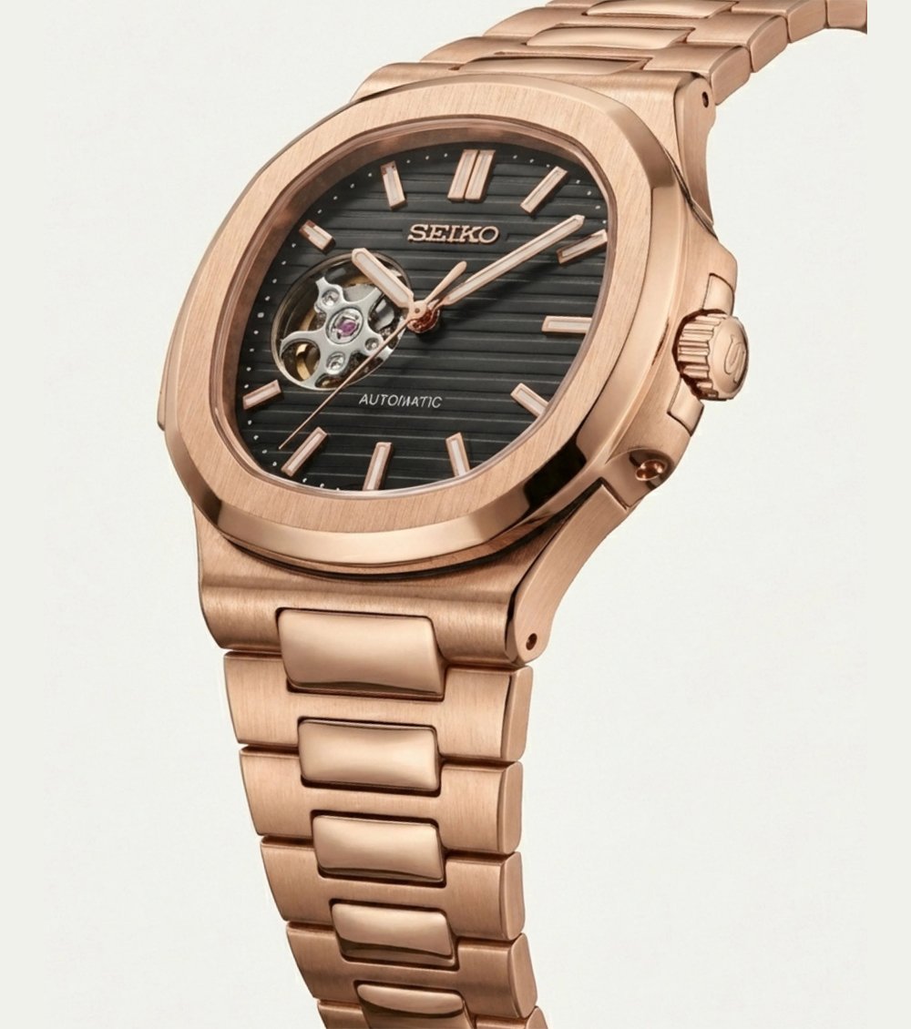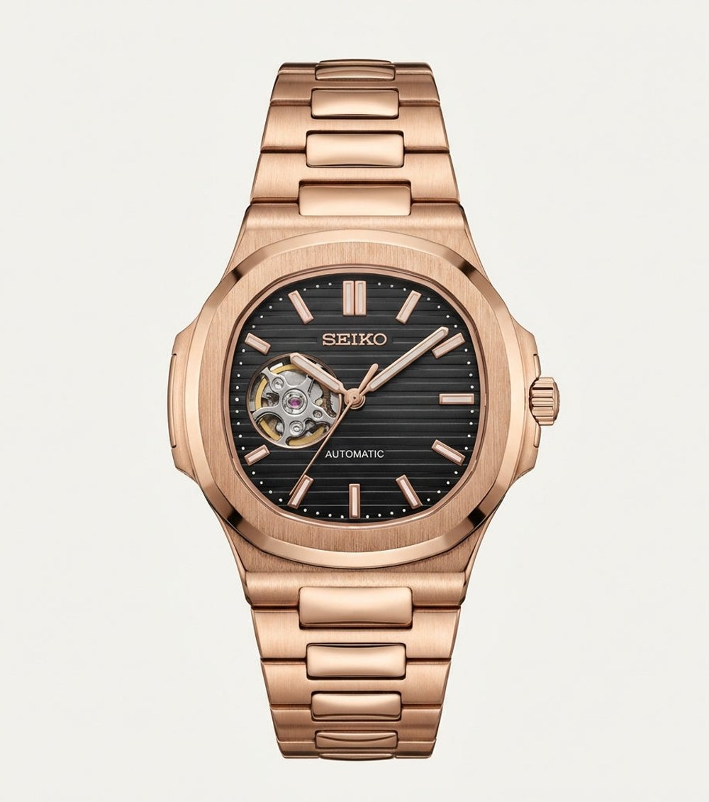 This sophisticated automatic timepiece pairs a warm rose gold-tone case with a deep black textured dial, creating a bold and refined wrist presence. The cushion-inspired case design and integrated bracelet offer a seamless, contemporary silhouette that balances strength with elegance.
