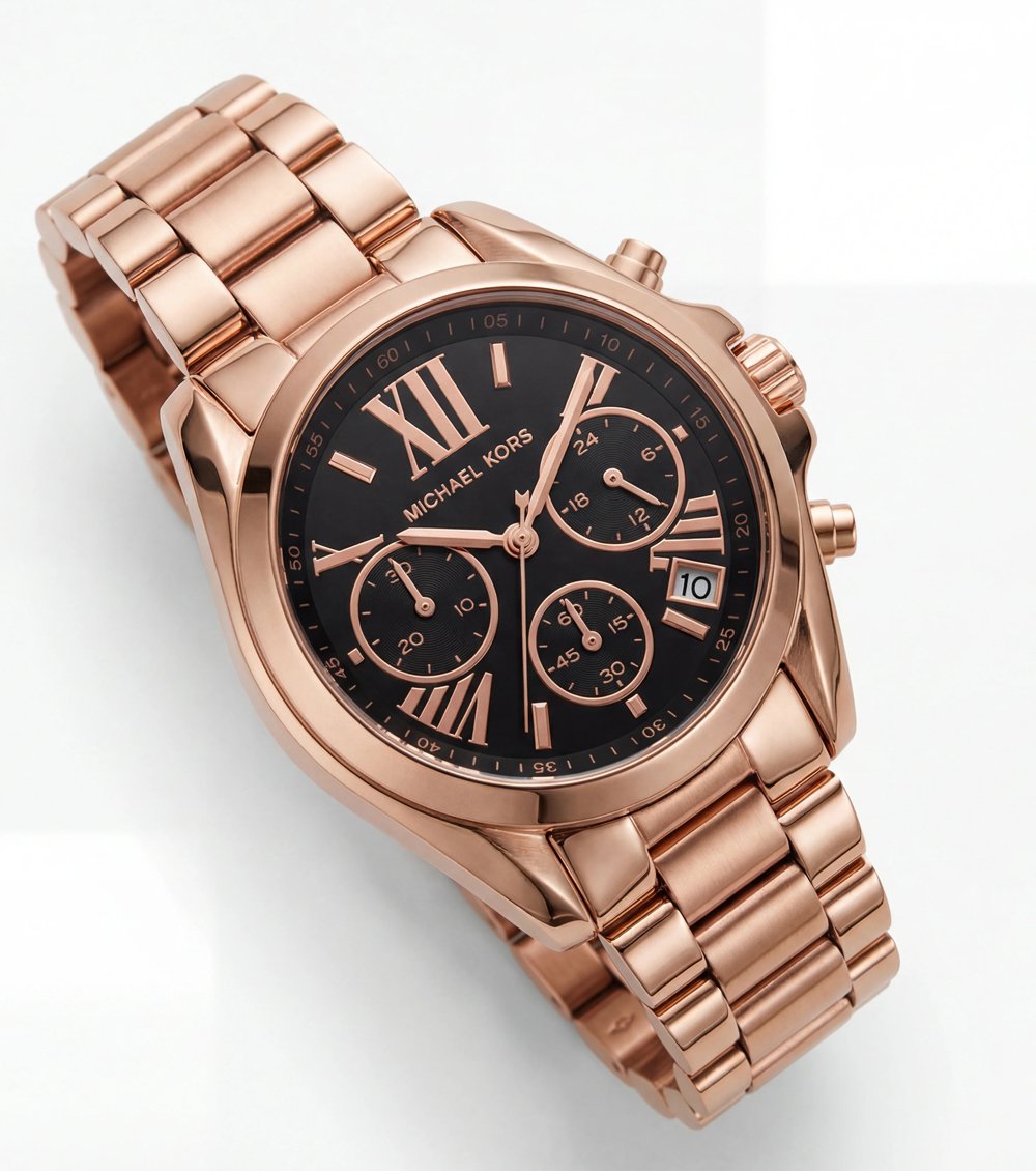 This elegant chronograph watch is designed for women who appreciate powerful design combined with refined detail. The polished rose-gold stainless steel case and bracelet create a striking monochrome look that feels both luxurious and timeless.