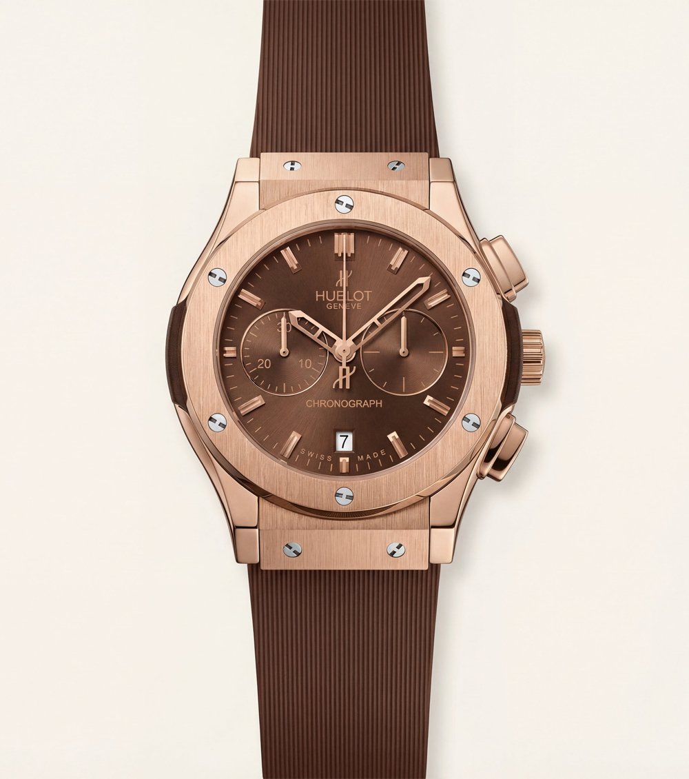 This elegant rose gold chronograph watch features a brushed metal case with an industrial screw-bezel design. The warm brown dial with matching sub-dials gives a rich and premium appearance, while the brown rubber strap ensures comfort and durability.