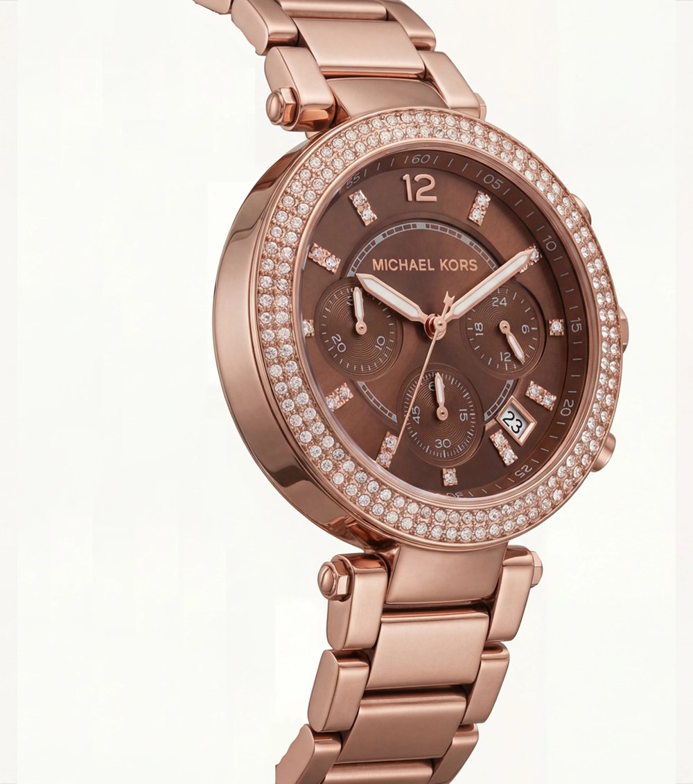 This all rose gold chronograph timepiece captures attention with its rich chocolate-brown dial, beautifully contrasted against a fully crystal-embellished bezel. The sunray texture enhances depth and dimension, while crystal hour markers add a subtle yet luxurious sparkle.