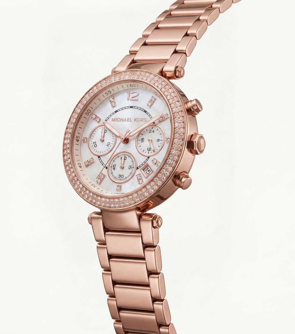 Radiant sophistication meets modern glamour in this rose gold chronograph timepiece. The luminous mother-of-pearl dial creates a soft, elegant glow, beautifully contrasted by rose-tone hands and crystal-accent hour markers that shimmer with every movement.