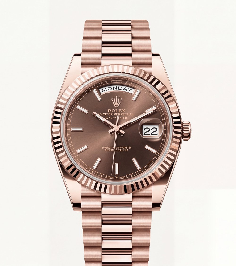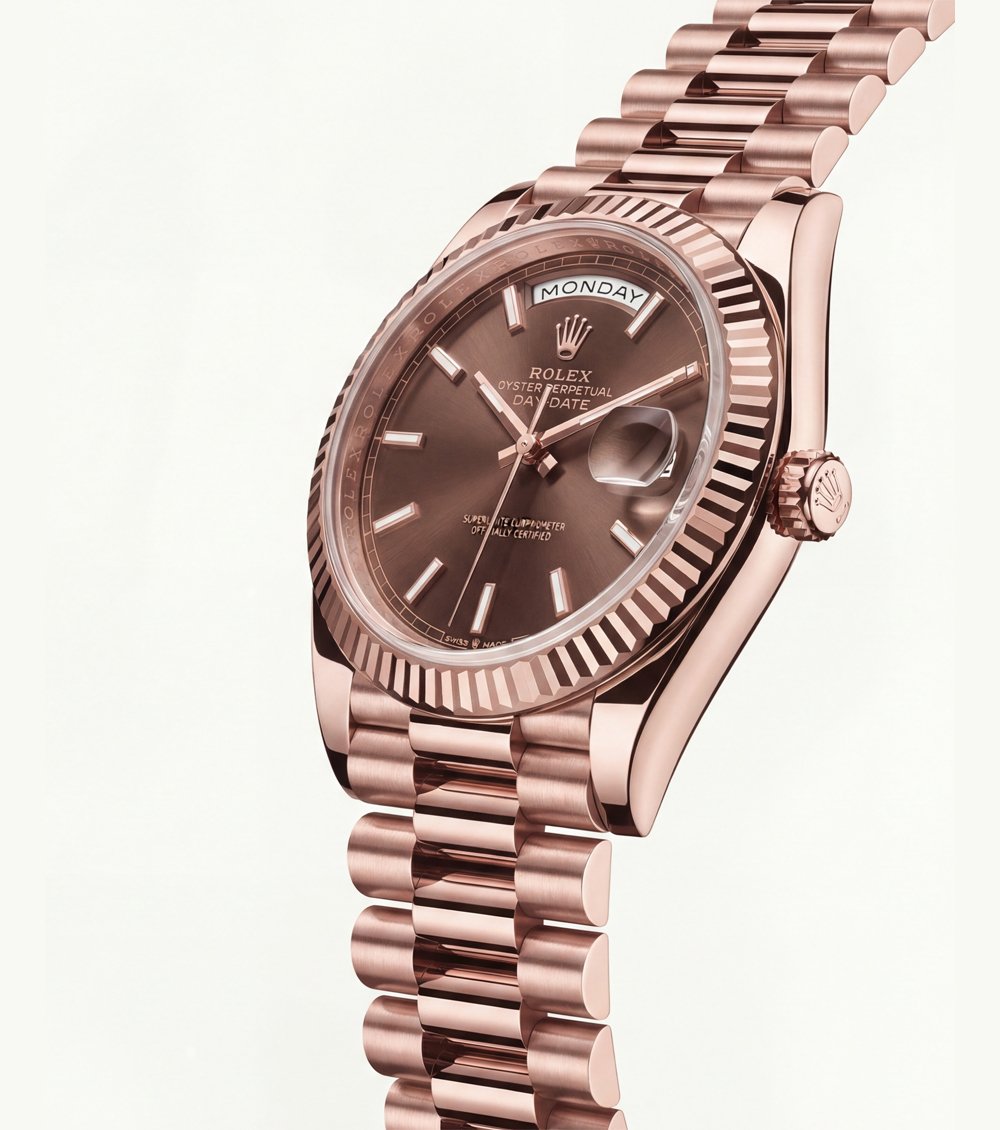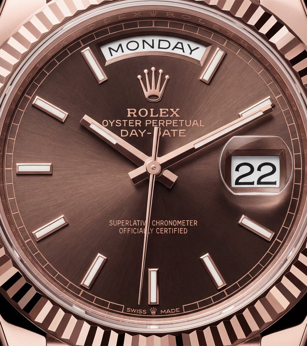 Elegant baton hour markers and polished rose gold hands enhance readability while preserving a clean, timeless aesthetic. The iconic full day display at 12 oรขโฌโขclock and magnified date window at 3 oรขโฌโขclock add both prestige and everyday practicality. A finely fluted bezel frames the dial with classic luxury detailing, elevating the overall design.