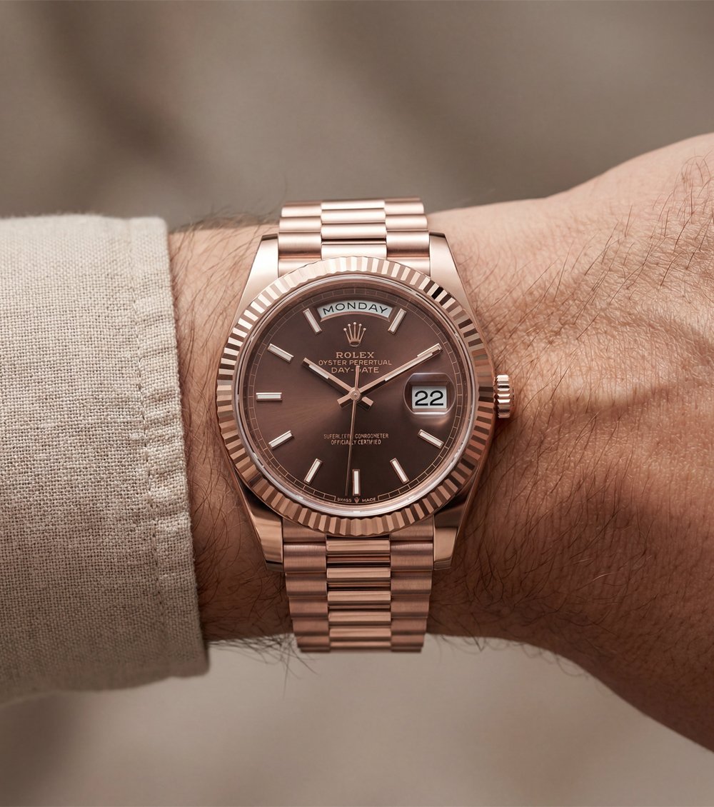 Refined, powerful, and unmistakably elite – this rose gold day-date Men’s luxury watch is designed for those who command attention without saying a word. The warm rose gold case and president-style bracelet deliver a bold yet sophisticated presence, perfectly complemented by the rich brown sunburst dial.