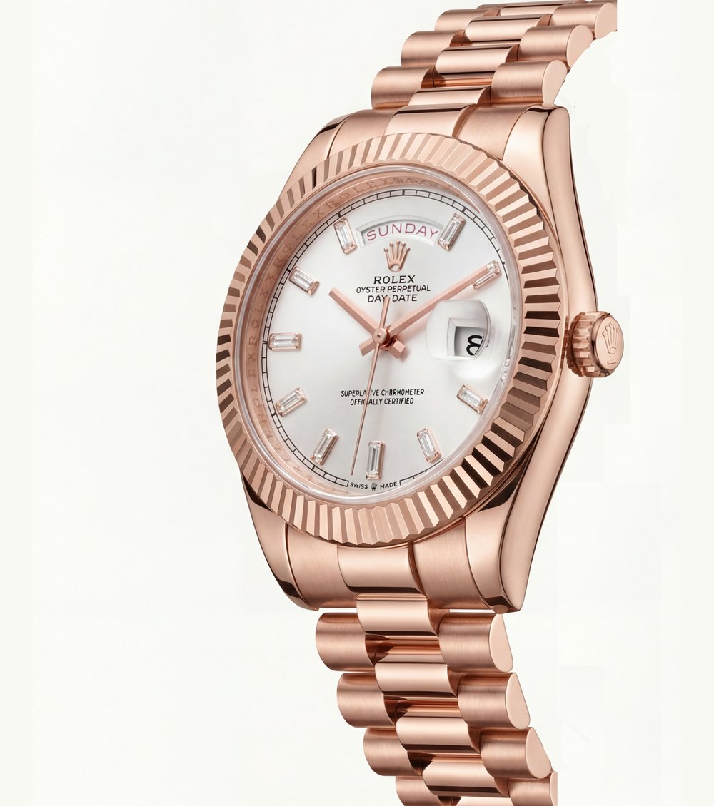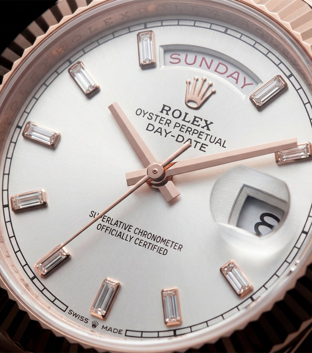 The refined silver dial features crystal-cut hour markers that catch the light beautifully, while the iconic day display at 12 oรขโ‚ฌโ„ขclock and magnified date window at 3 oรขโ‚ฌโ„ขclock deliver both function and unmistakable luxury appeal. A finely fluted bezel frames the dial, adding depth, texture, and heritage-inspired sophistication.