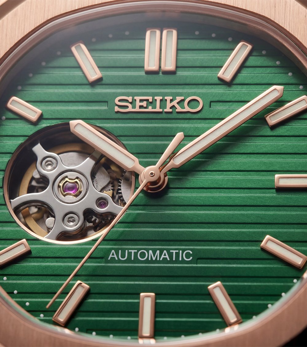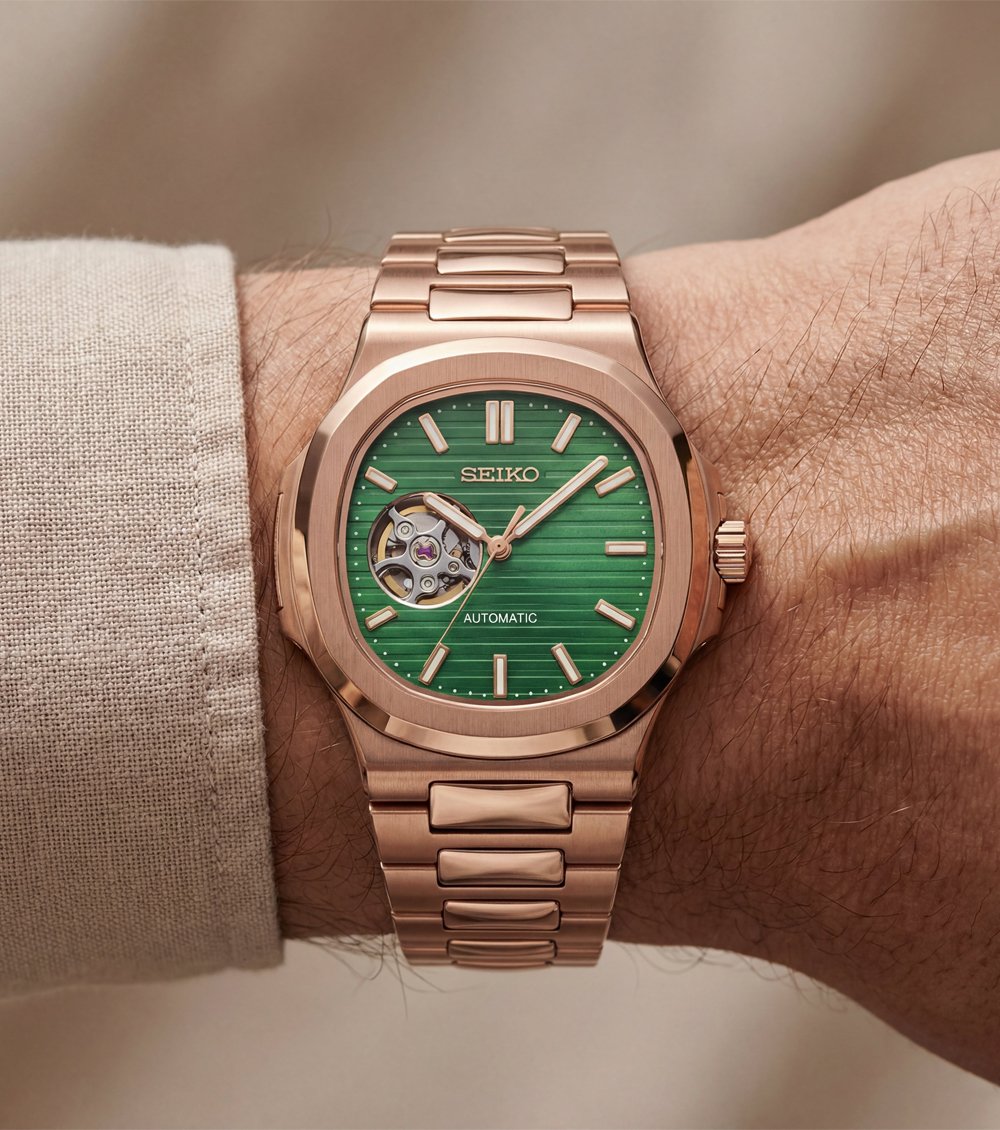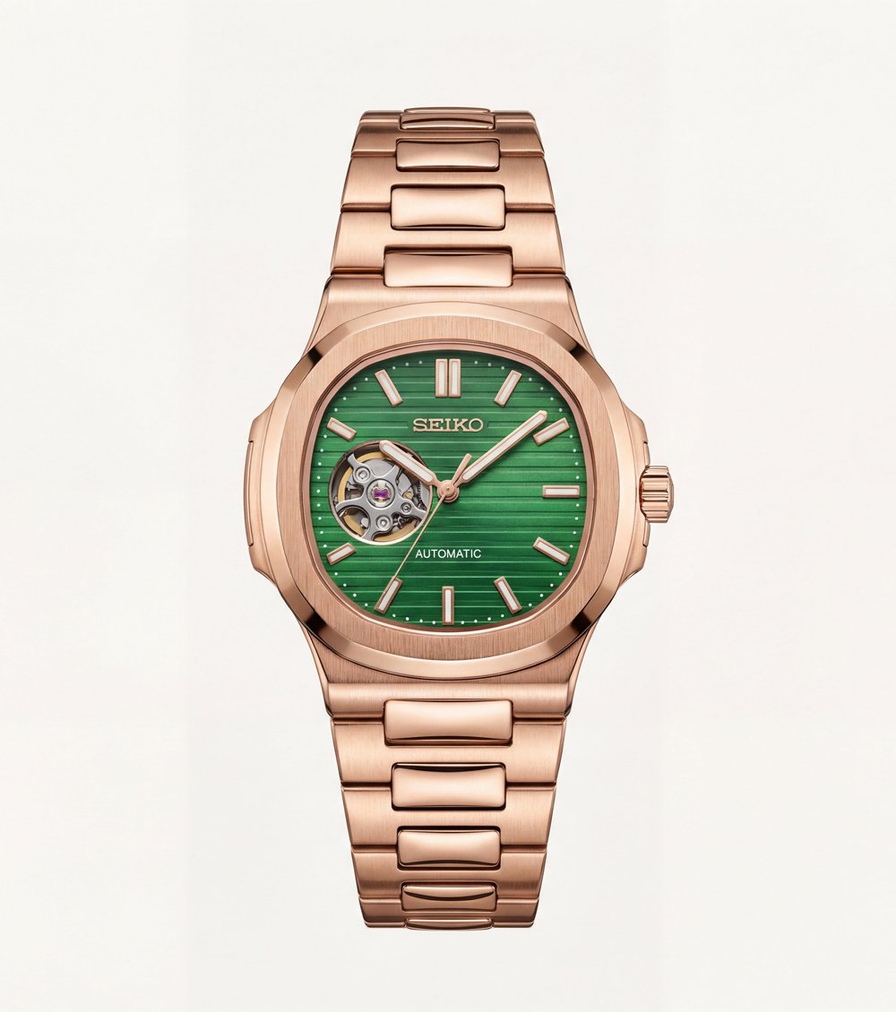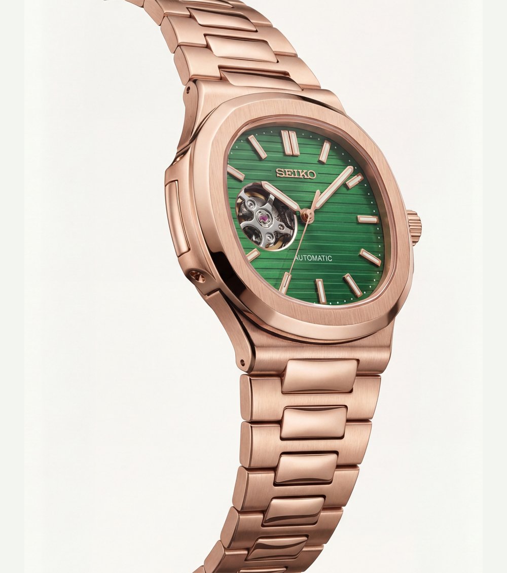 This refined automatic timepiece blends warm rose gold tones with a striking deep green dial, creating a bold yet sophisticated wrist presence. The cushion-inspired case design and integrated bracelet deliver a seamless, modern silhouette that feels both contemporary and timeless.