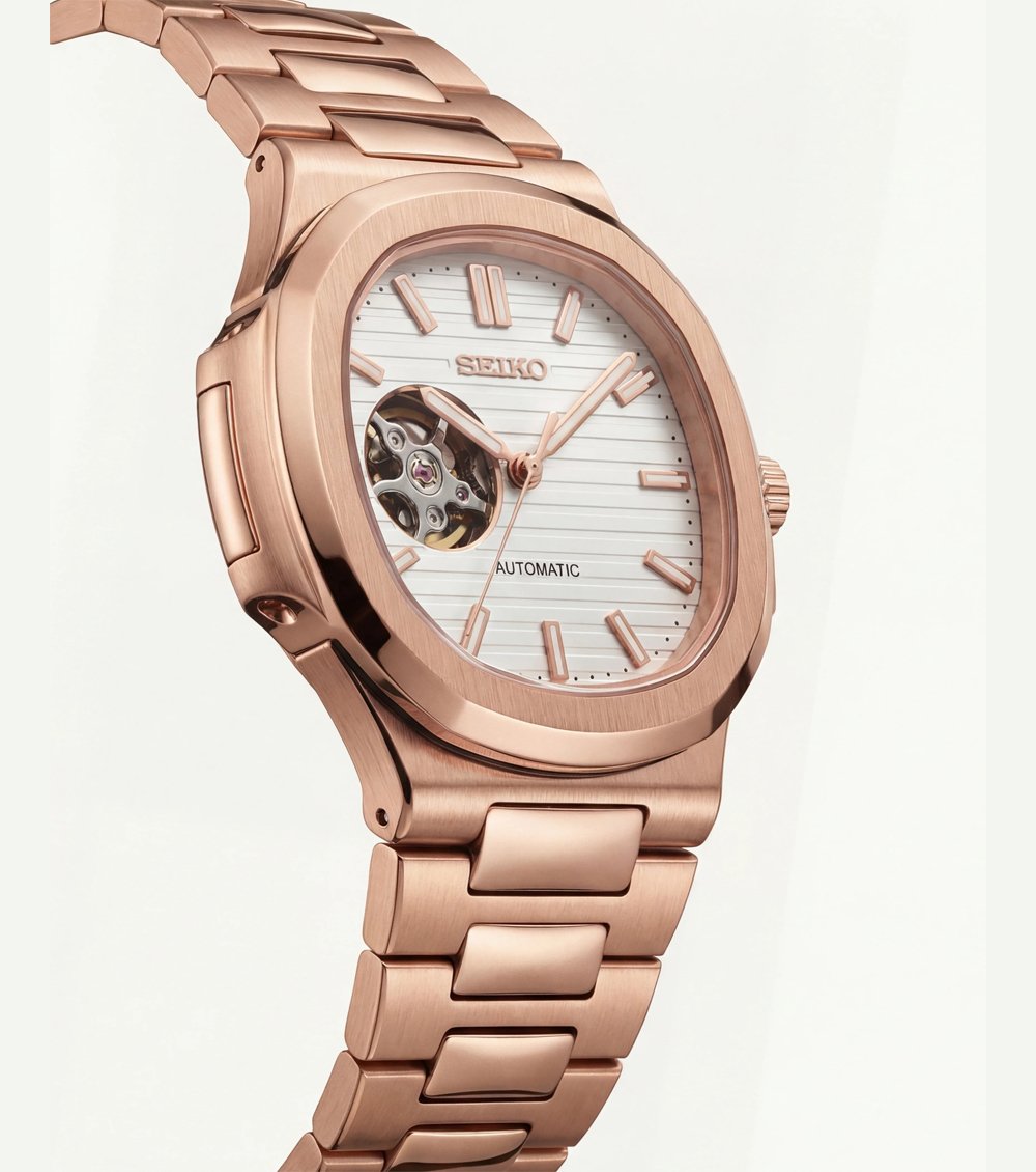 This elegant automatic timepiece showcases refined craftsmanship with a warm rose gold-tone finish and a structured cushion-shaped case. The integrated bracelet design creates a seamless silhouette, delivering a bold yet sophisticated wrist presence.