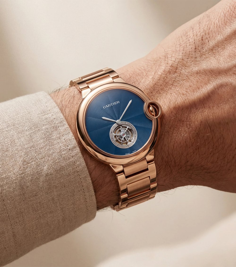 This elegant rose gold luxury watch features a deep blue textured dial with a stunning open-heart mechanical window that reveals the inner balance wheel. Its smooth round case and integrated rose gold bracelet give it a refined, high-fashion appearance.