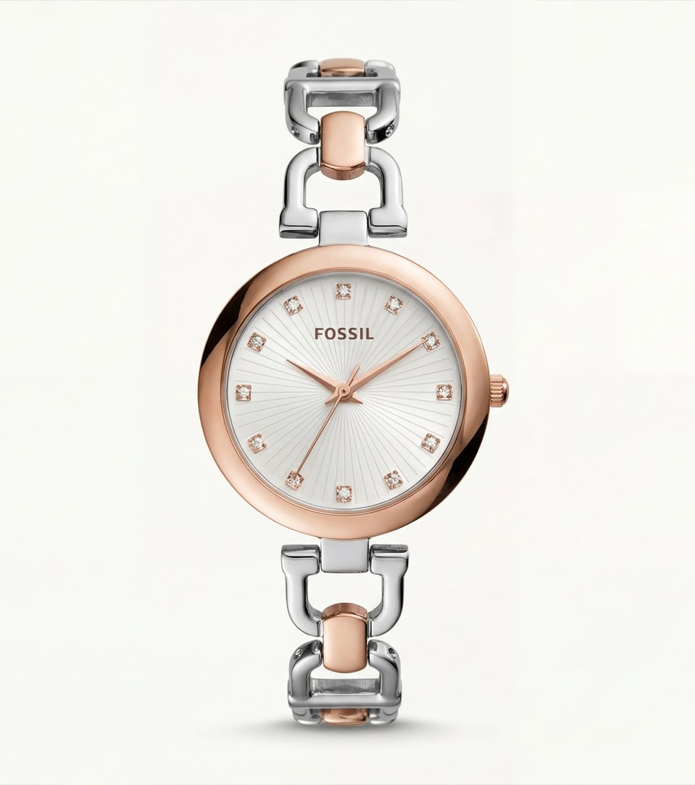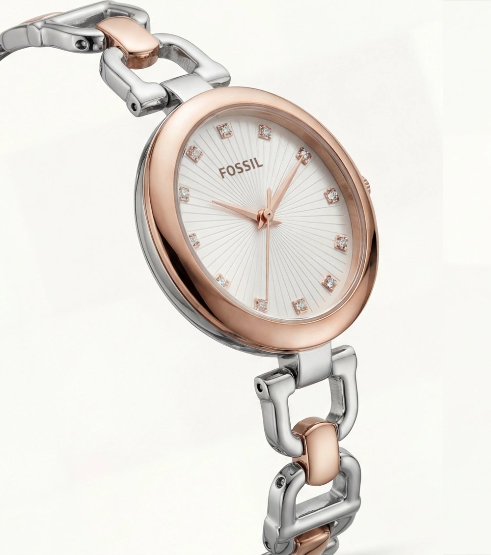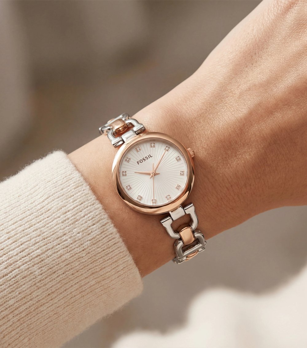 The two-tone bracelet, blending silver links with rose gold accents, creates a jewelry-inspired silhouette that feels more like a fine accessory than a traditional watch. Lightweight yet durable, it sits comfortably on the wrist โ€” perfect for daily elegance, office wear, festive styling, or evening occasions.