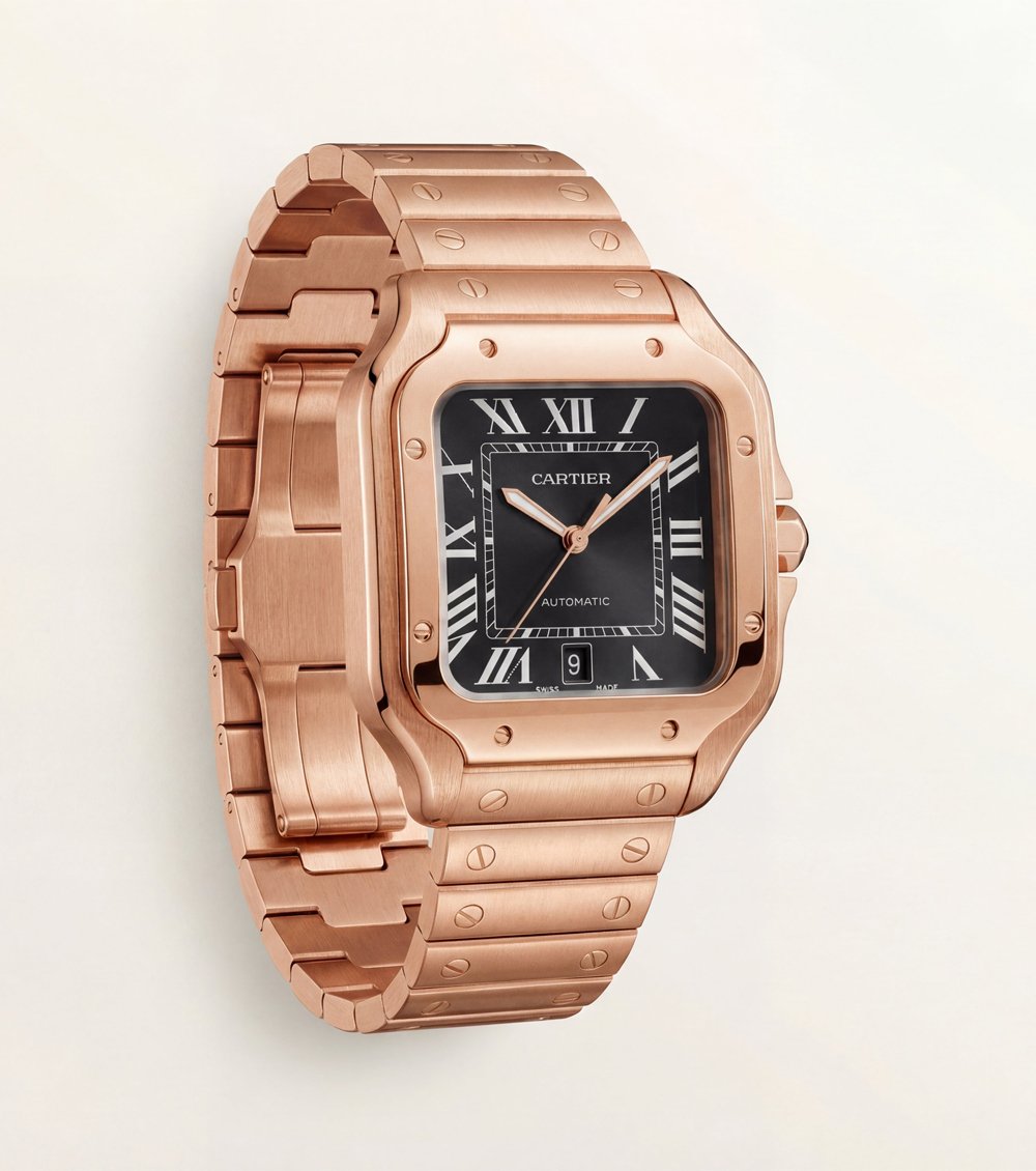 This luxurious automatic watch features a bold square case finished in an elegant rose-gold tone, delivering a refined yet powerful wrist presence. The deep black dial is accented with classic Roman numerals, creating a timeless contrast that enhances clarity and sophistication.