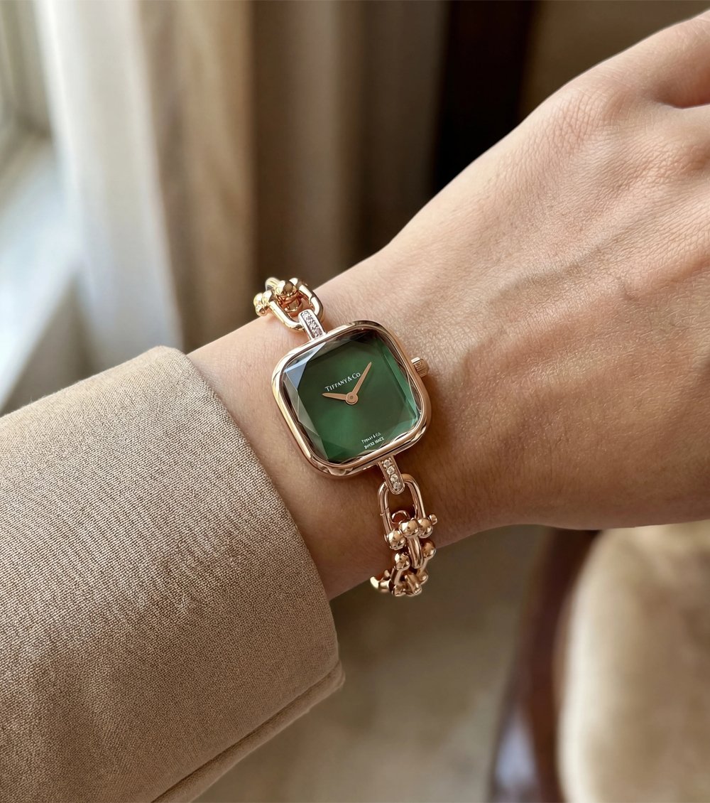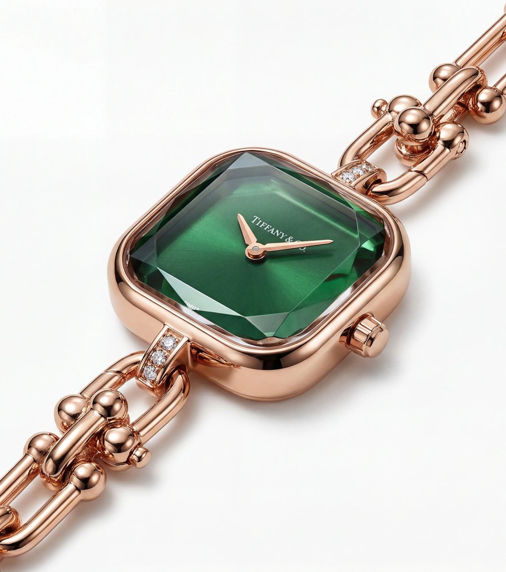 At the center lies a striking emerald green sunray dial, radiating depth and brilliance as light reflects across its faceted surface. The rich green tone creates a captivating contrast against the rose gold case, giving the watch a luxurious and sophisticated presence.