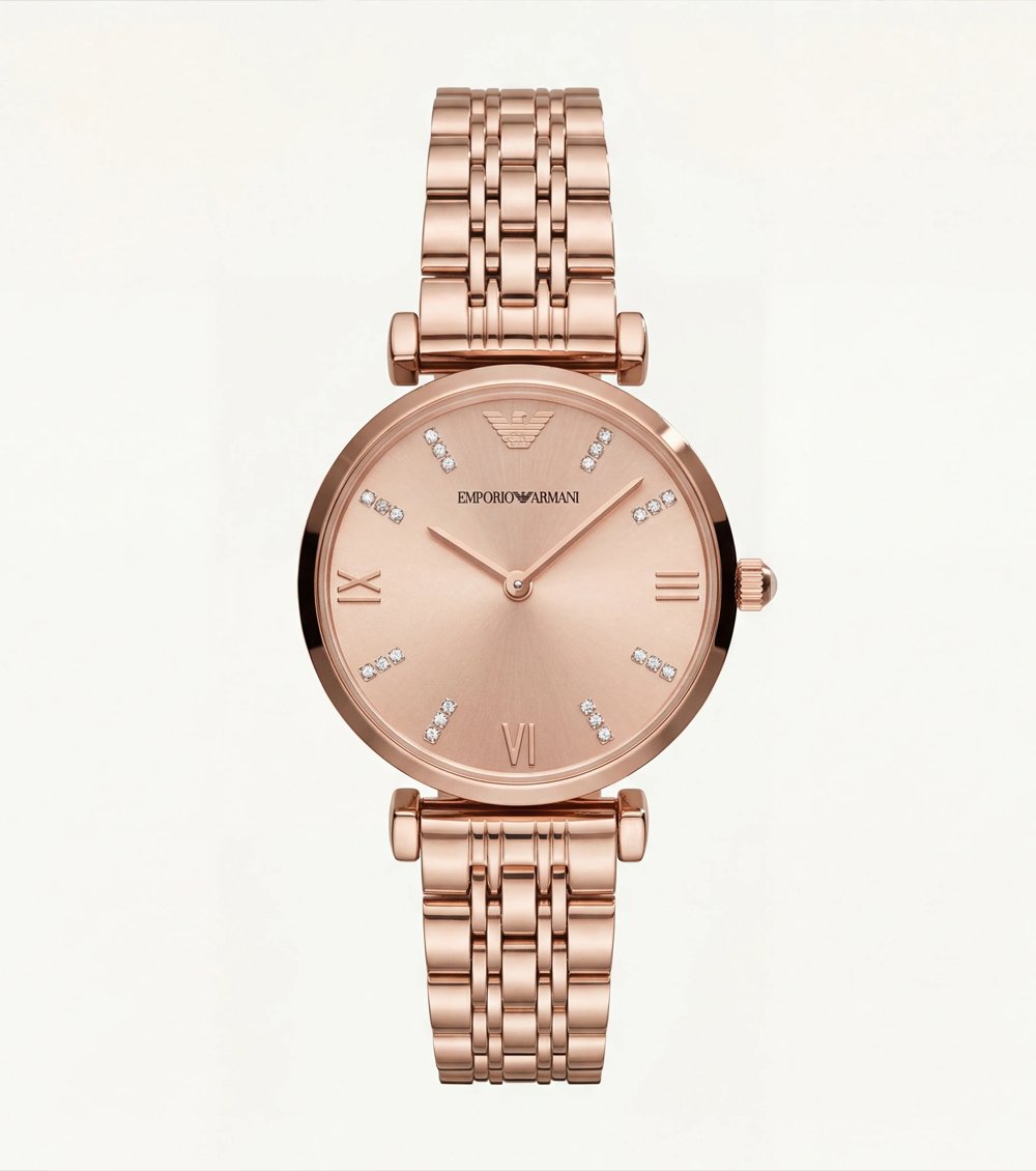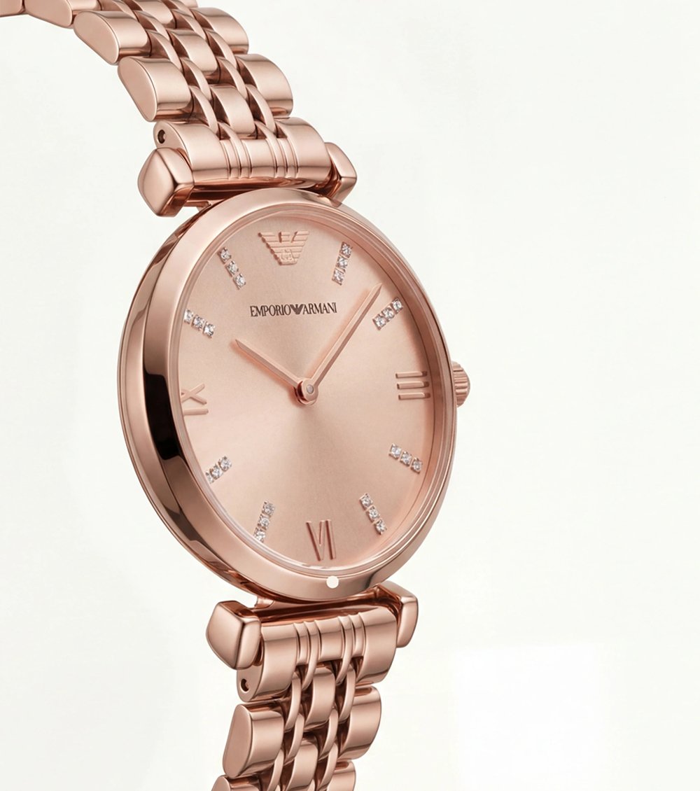 Crystal hour accents are thoughtfully placed to add subtle sparkle without overpowering the clean design. Roman numerals and slim index markers in matching rose gold maintain balance and structure, enhancing the watchรขโ‚ฌโ„ขs refined aesthetic.
