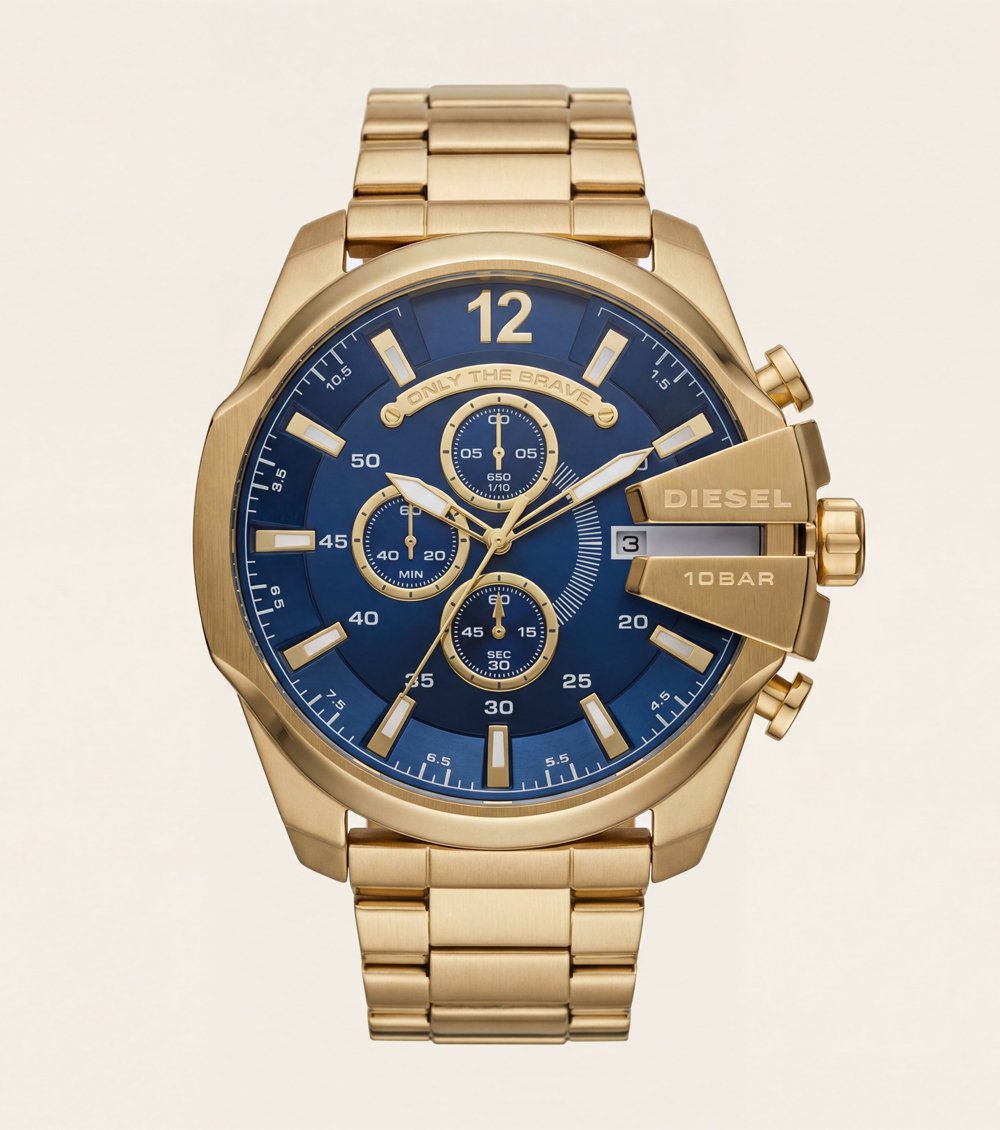 Applied hour markers and luminous hands ensure clear readability, complemented by a precise multi-subdial chronograph layout for everyday performance. Gold-accented details enhance the refined look, while the structured side-guard design adds a distinctive industrial edge. Designed for durability and standout styling, this timepiece is ideal for festive wear, evening looks, and statement fashion.