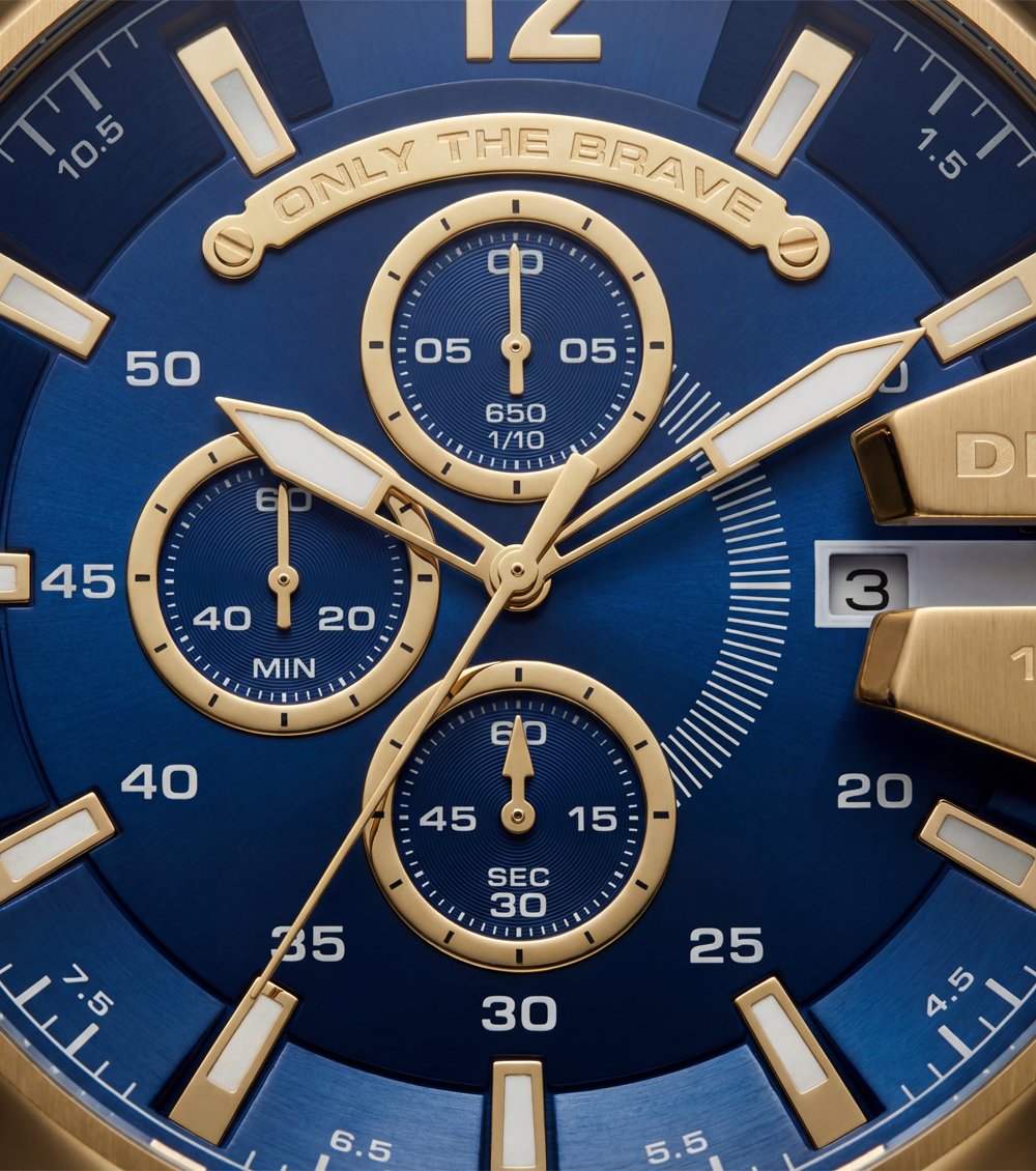 This striking chronograph watch features a luxurious gold-tone steel construction paired with a rich blue dial, creating a bold and premium wrist presence. The solid stainless steel case and bracelet offer a confident, heavyweight feel, while the deep blue dial adds contrast and visual depth.