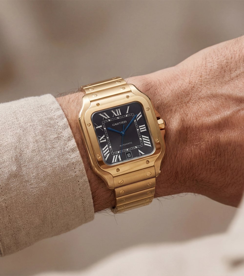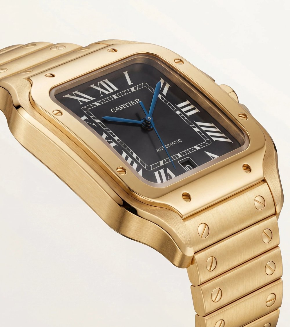 Polished blue-toned hands add a refined accent, while the structured bezel with exposed screw detailing brings a distinctive architectural character. The integrated gold-finish stainless steel bracelet offers a seamless flow from case to wrist, reflecting solid craftsmanship and premium styling.