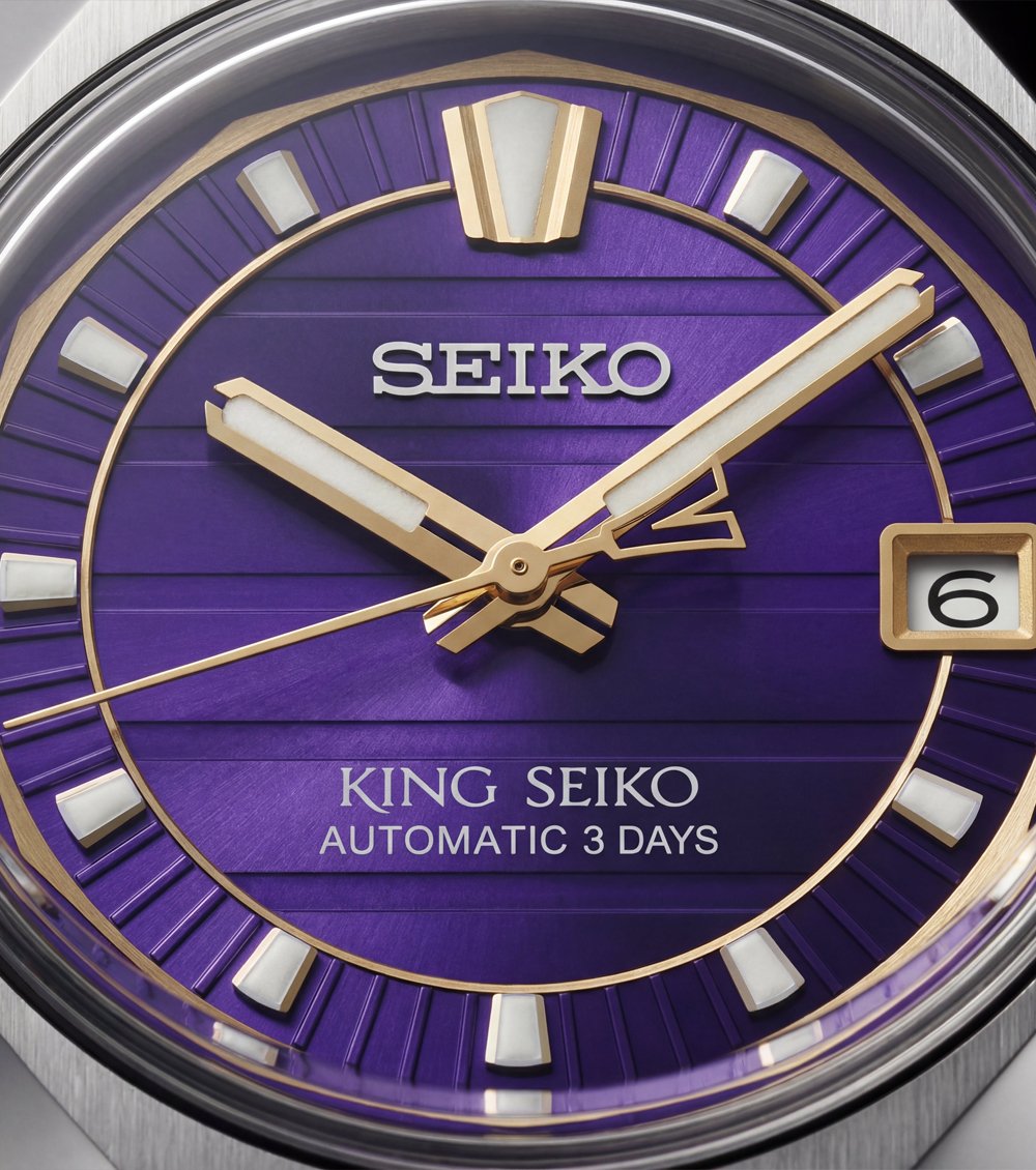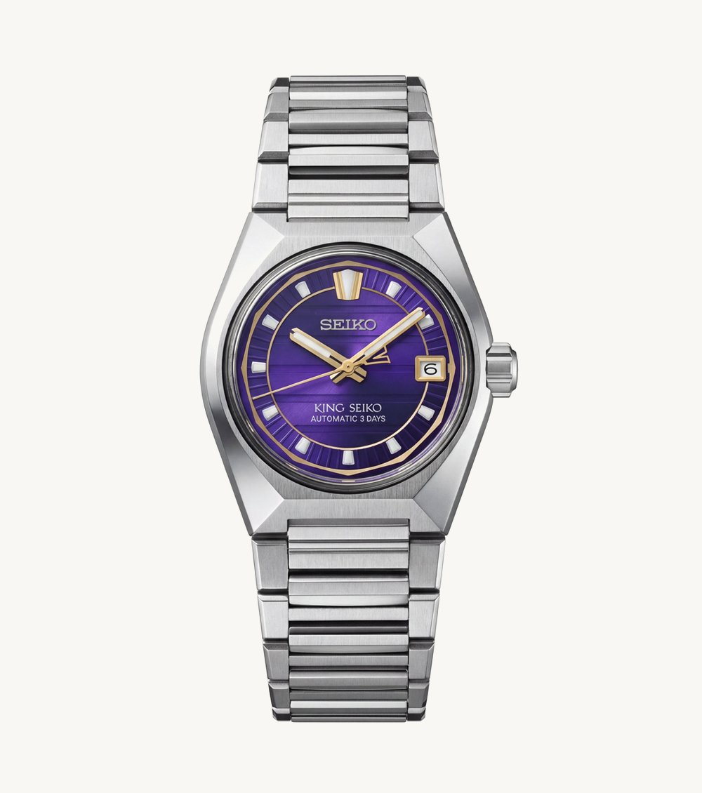 This striking automatic watch blends heritage design with a bold modern color palette. Crafted from brushed stainless steel, the watch features a deep royal-purple dial enhanced with subtle radial texture and gold-tone accents for a luxurious contrast. The applied hour markers and sharp luminous hands ensure excellent readability while elevating the overall elegance.