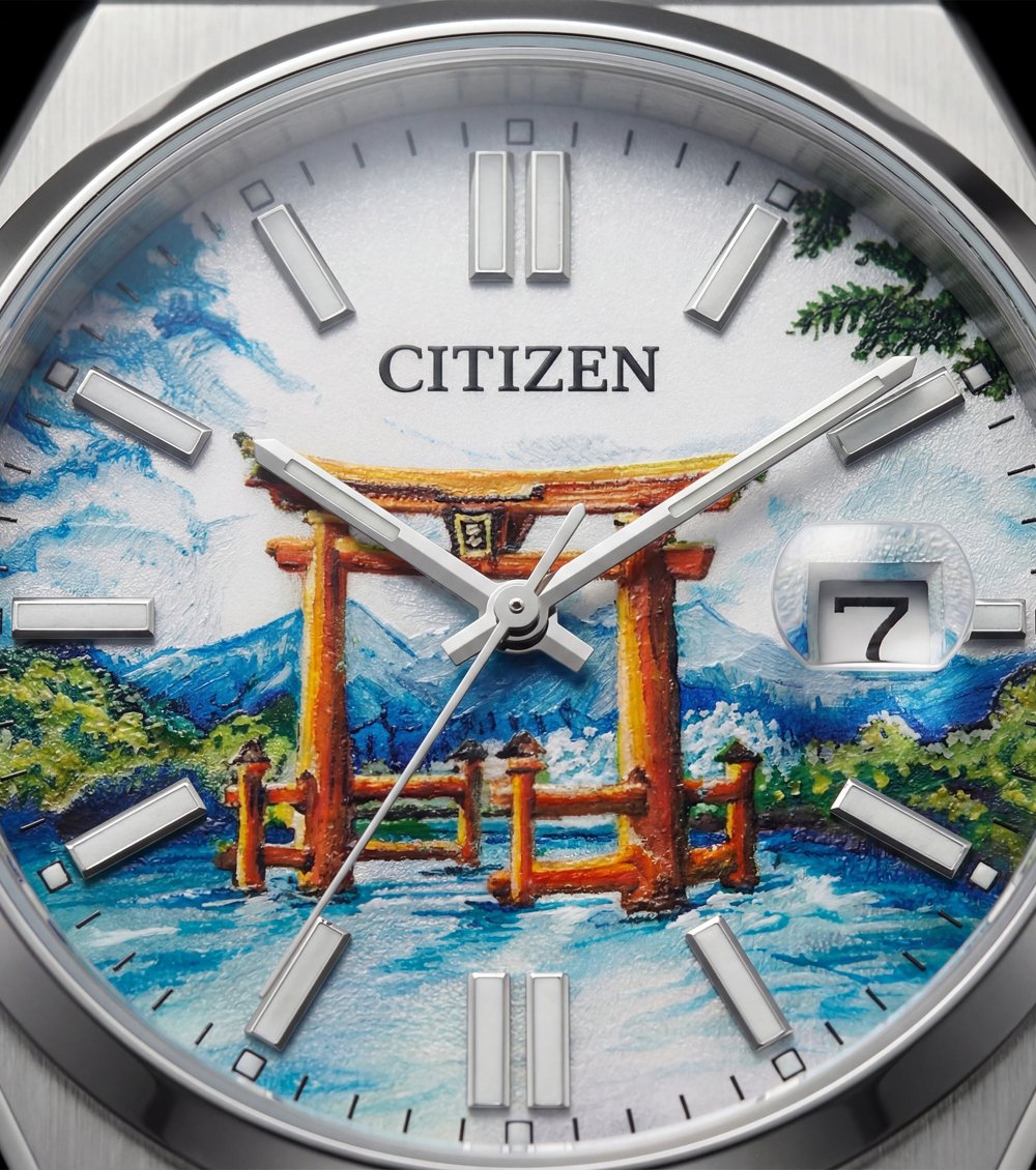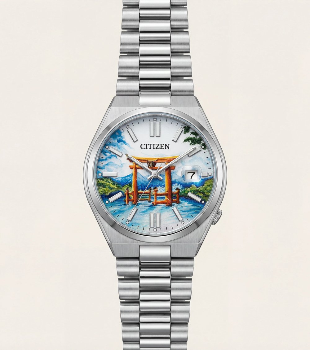 Ye premium Men’s watch ek elegant scenic art dial ke saath aata hai jisme mountain landscape aur traditional wooden gate artwork beautifully illustrated hai. Soft silver background ke saath blue water aur green nature detailing dial ko artistic aur calm luxury look deti hai. Applied index hour markers aur sharp silver hands clean aur modern readability ensure karte hain.