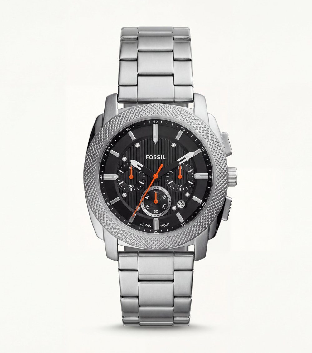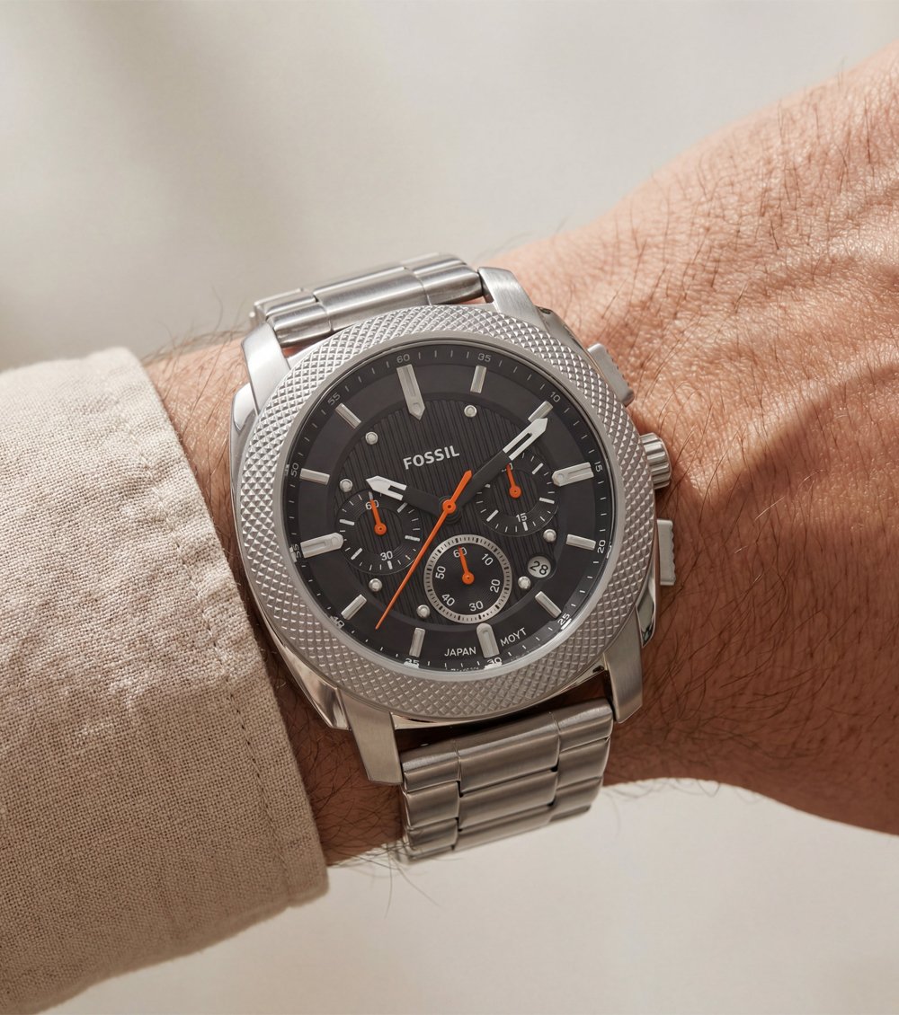 This silver chronograph Men’s watch delivers a bold industrial aesthetic combined with precise functionality. The textured stainless steel bezel frames a deep black dial featuring three chronograph sub-dials, accented with striking orange hands that add energy and contrast to the design.