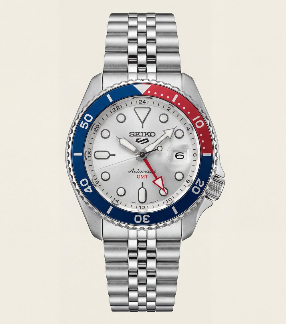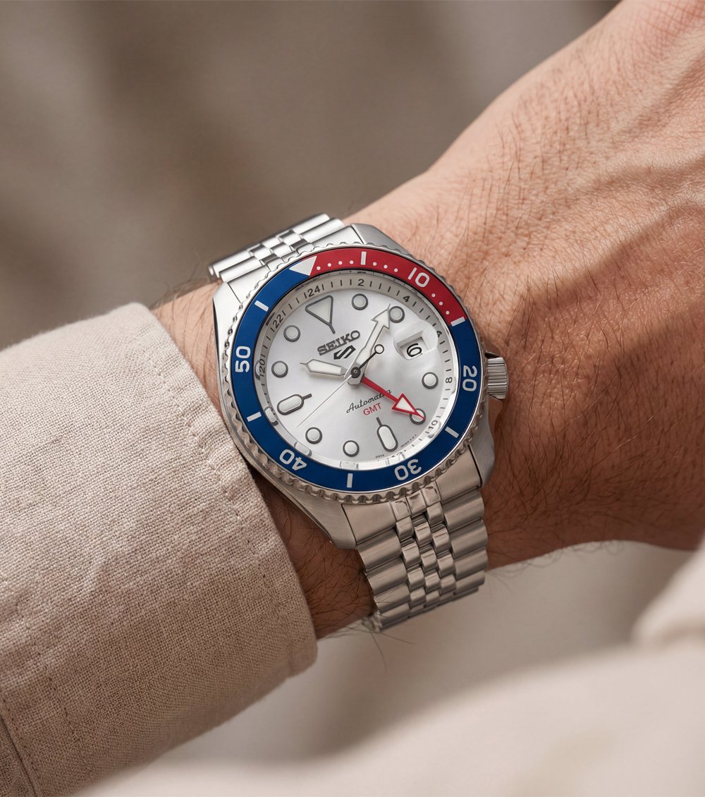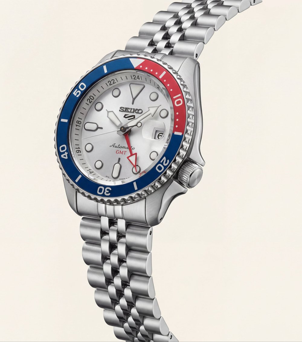 This bold automatic GMT watch features a clean silver dial paired with a striking red and blue 24-hour bezel, delivering a sporty and travel-inspired wrist presence. The vibrant dual-tone bezel adds strong visual contrast while enhancing functional readability for second time zone tracking.